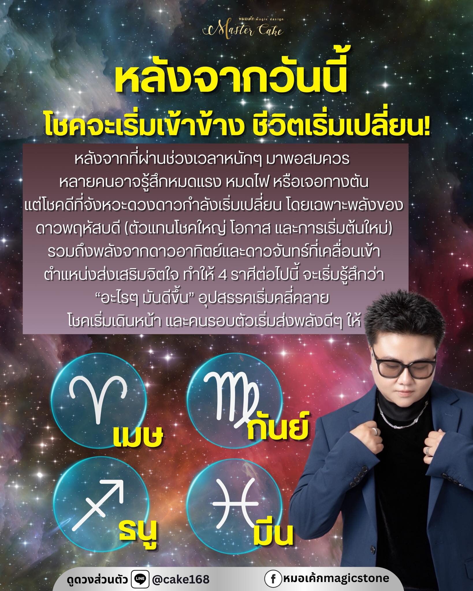 หมอเค้กMagic stone เผยถึงดวงชะตาราศี หลังจากวันนี้ โชคจะเริ่มเข้าข้าง ชีวิตเริ่มเปลี่ยน หลังจากผ่านช่วงเวลาหนักๆ มาพอสมควร หลายคนอาจรู้สึกหมดแรง หมดไฟ หรือเจอทางตัน แต่โชคดีที่จังหวะดวงดาวกำลังเริ่มเปลี่ยน โดยเฉพาะพลังของดาวพฤหัส ที่เป็นตัวแทนของโชคใหญ่และการเริ่มต้นใหม่ รวมถึงพลังจากดาวอาทิตย์และดาวจันทร์ที่เคลื่อนเข้าตำแหน่งส่งเสริมจิตใจ ทำให้ราศีนี้ต่อไปจะเริ่มรู้สึกว่าดีขึ้น อุปสรรคคลี่คลาย โชคเริ่มเดินหน้า และคนรอบตัวเริ่มส่งพลังดีๆ ให้