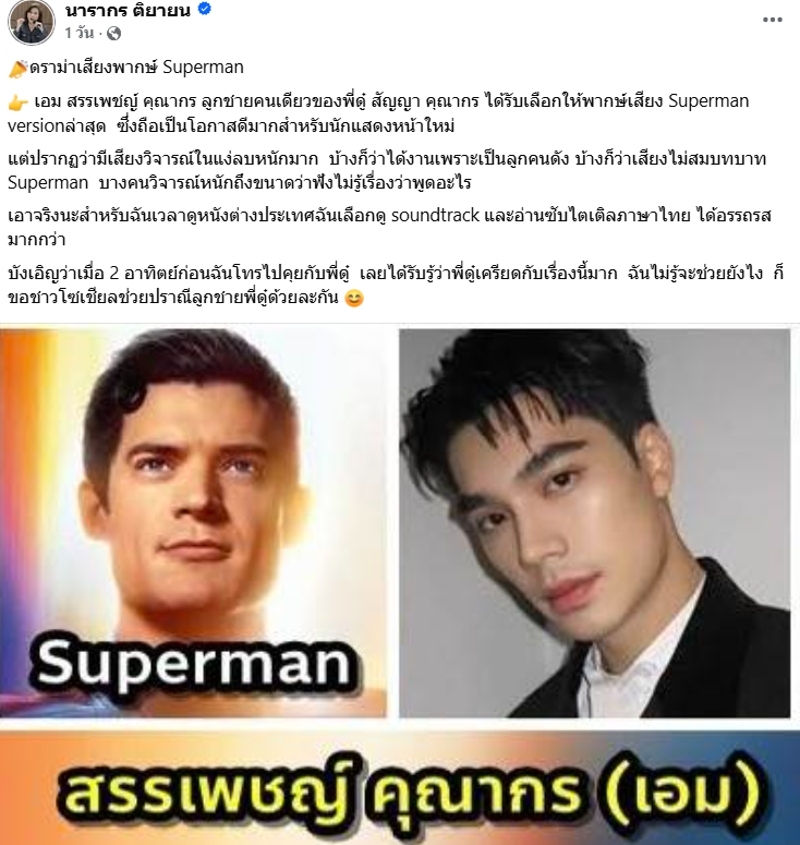 อ่านข่าวต้นฉบับได้ที่ : ต๊ะ นารากร วอนชาวโซเชียลปรานี ดราม่า เอม พากย์เสียง Superman ดู๋ เครียด
