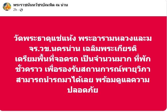 ด้าน พระราชนันทวัชรบัณฑิต ณ น่าน โพสต์ข้อความระบุว่า วัดพระธาตุแช่แห้ง พระอารามหลวงและ มจร.วข.นครน่าน เฉลิมพระเกียรติ เตรียมพื้นที่จอดรถ เป็นจำนวนมาก ที่พักชั่วคราว เพื่อรองรับสถานการณ์พายุวิภา สามารถนำรถมาได้เลย พร้อมดูแลความปลอดภัย
