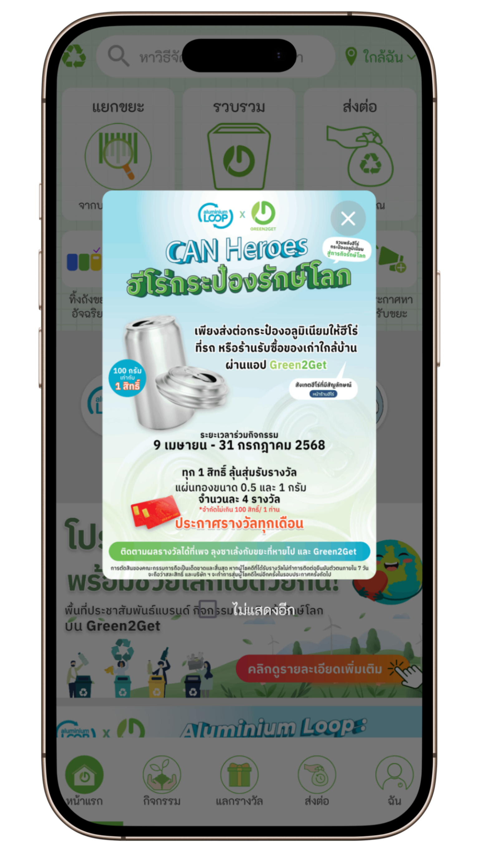 หนึ่งในไฮไลต์ของแคมเปญนี้คือ การเชิญชวนให้ประชาชนขายคืนกระป๋องอลูมิเนียมใช้แล้วผ่านแอปพลิเคชัน Green2Get ซึ่งจะมีการบันทึกข้อมูลแบบเรียลไทม์ พร้อมสะสมแต้มเพื่อลุ้นรับทองคำหนัก 1 กรัม และ 0.5 กรัม รวม 12 รางวัล ตลอดระยะเวลาแคมเปญ ตั้งแต่วันนี้จนถึงวันที่ 31 กรกฎาคม 2568
