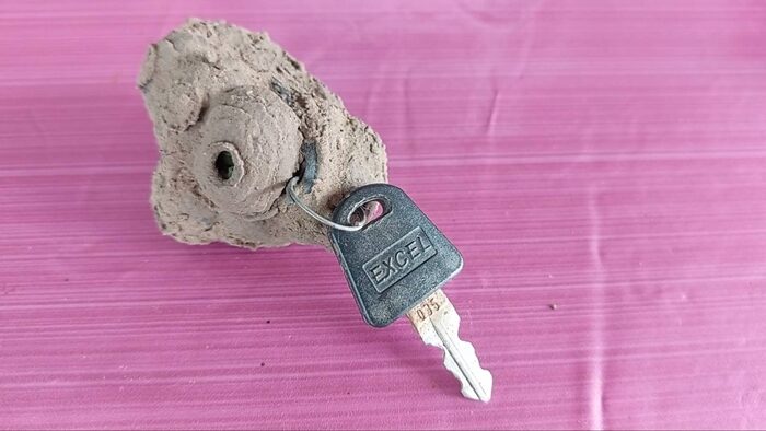 น.ส.ประกาย กล่าวว่า กุญแจพวงนี้เป็นลูกกุญแจของตู้เสื้อผ้าที่เปิดใช้อยู่ทุกวัน แต่พอตนไม่ได้อยู่บ้านเพียง 1 วันเท่านั้น ตกค่ำกลับมาเปิดตู้จะหยิบเสื้อผ้ามาใส่ กลับพบว่า พวงกุญแจถูกห่อหุ้มด้วยก้อนดิน