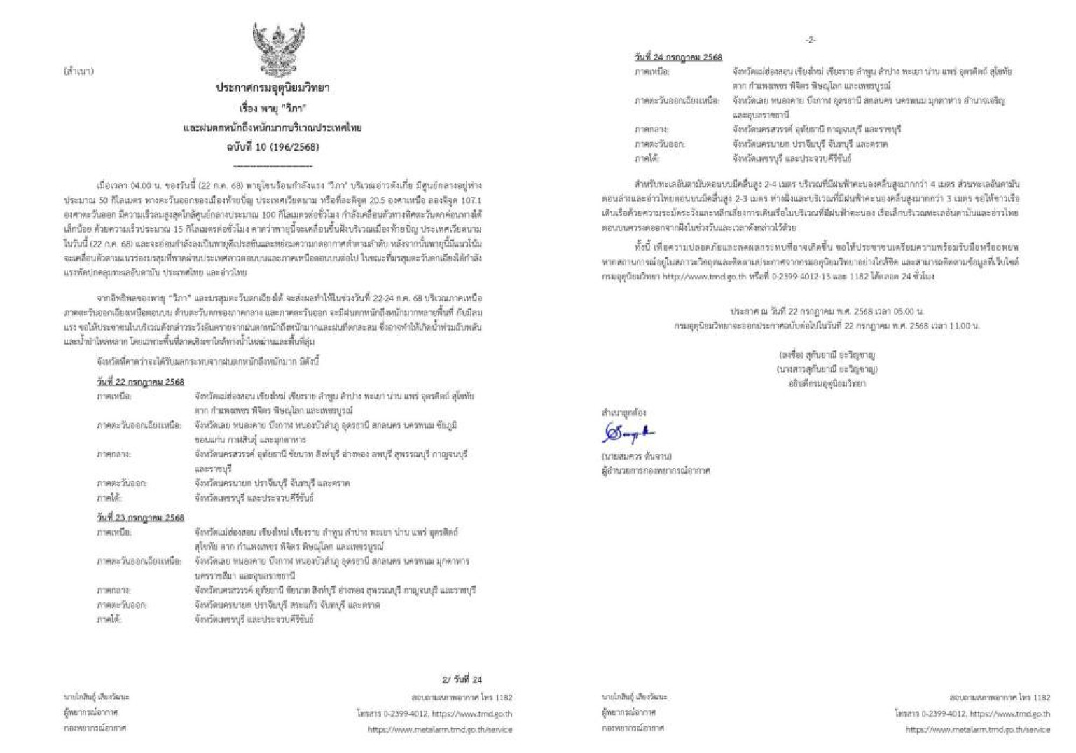 วันที่ 22 ก.ค.68 นางสาวสุกันยาณี ยะวิญชาญ อธิบดีกรมอุตุนิยมวิทยา ออกประกาศกรมอุตุนิยมวิทยาเรื่อง พายุ "วิภา" และฝนตกหนักถึงหนักมากบริเวณประเทศไทยฉบับที่ 10 (196/2568) ความว่า