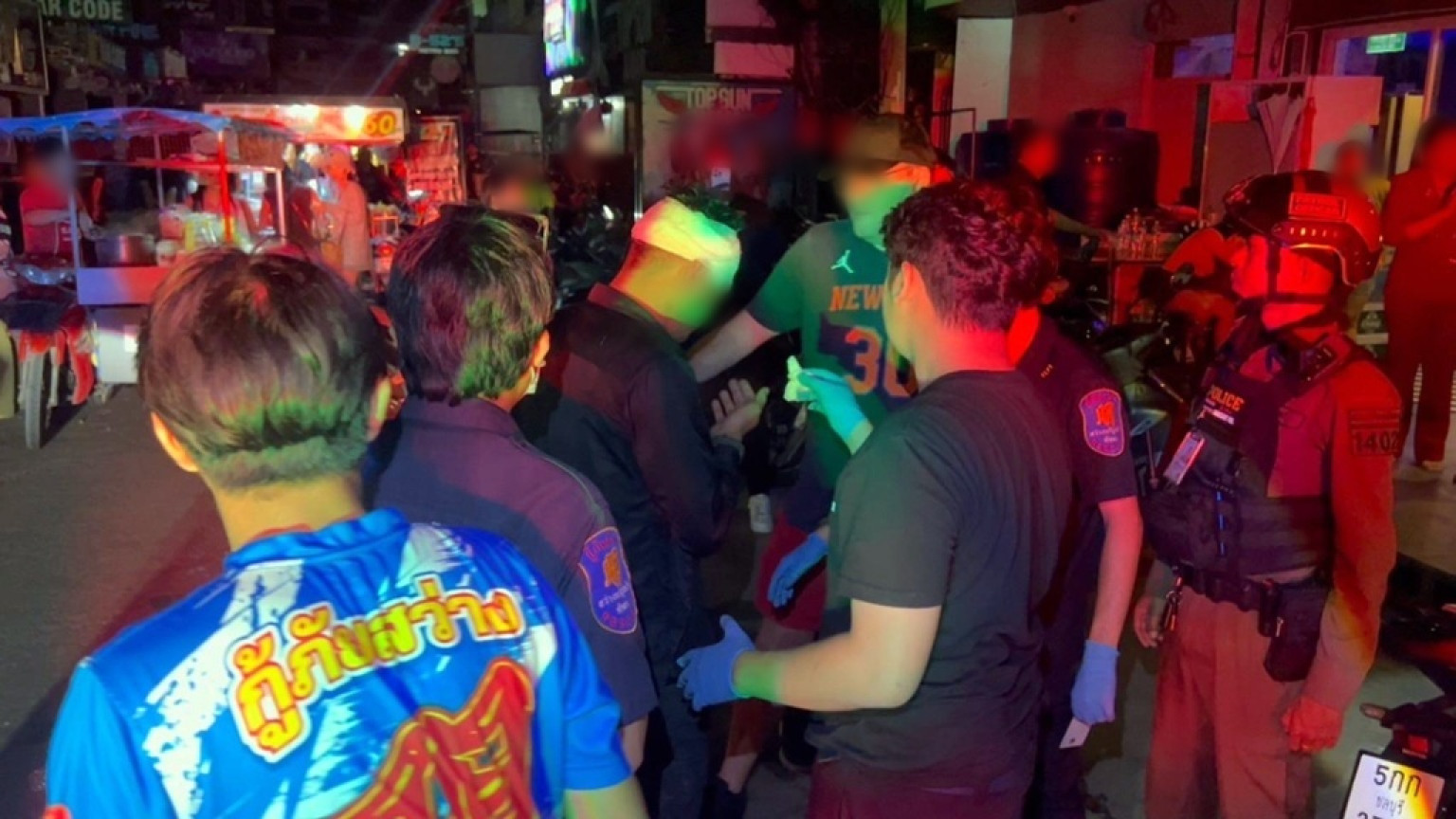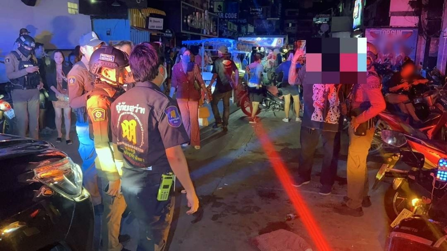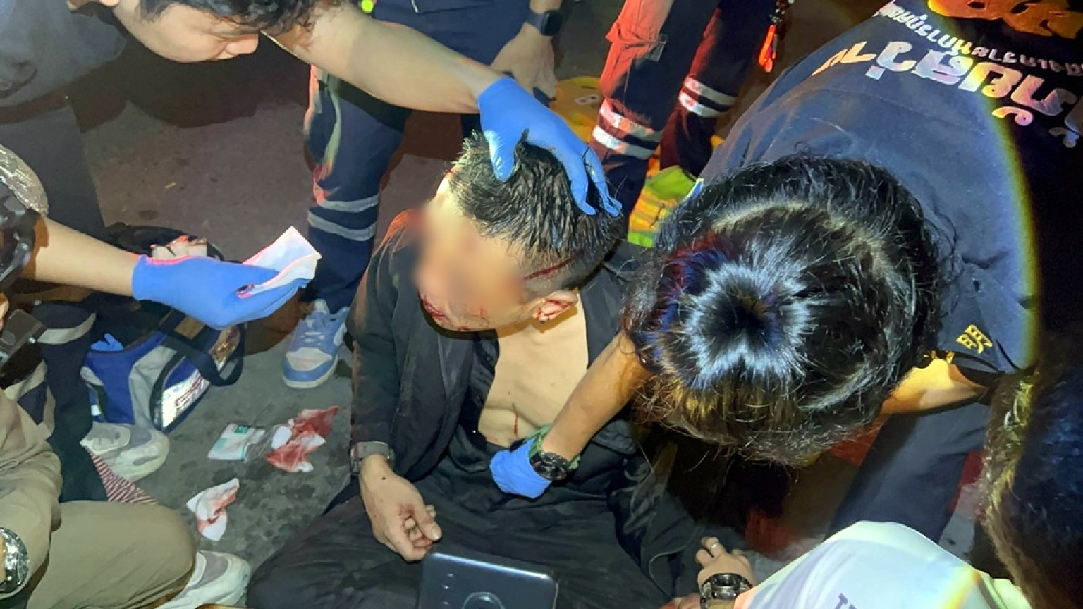 ที่เกิดเหตุ พบชาวบ้านและนักท่องเที่ยวอยู่ในอาการแตกตื่นมุงดูเหตุการณ์ พบนายวรพงษ์ อายุ 41 ปี พนักงานรักษาความปลอดภัยของสถานบันเทิงแห่งหนึ่ง ถูกรุมทำร้ายร่างกาย ได้รับบาดเจ็บมีบาดแผลแตกเลือดไหลอาบใบหน้า ฟกช้ำถลอกตามร่างกายหลายจุด อยู่ในอาการมึนงง เจ้าหน้าที่กู้ภัยฯ ให้การช่วยเหลือปฐมพยาบาลเบื้องต้น ก่อนเคลื่อนย้ายส่งโรงพยาบาลฯ อย่างเร่งด่วน