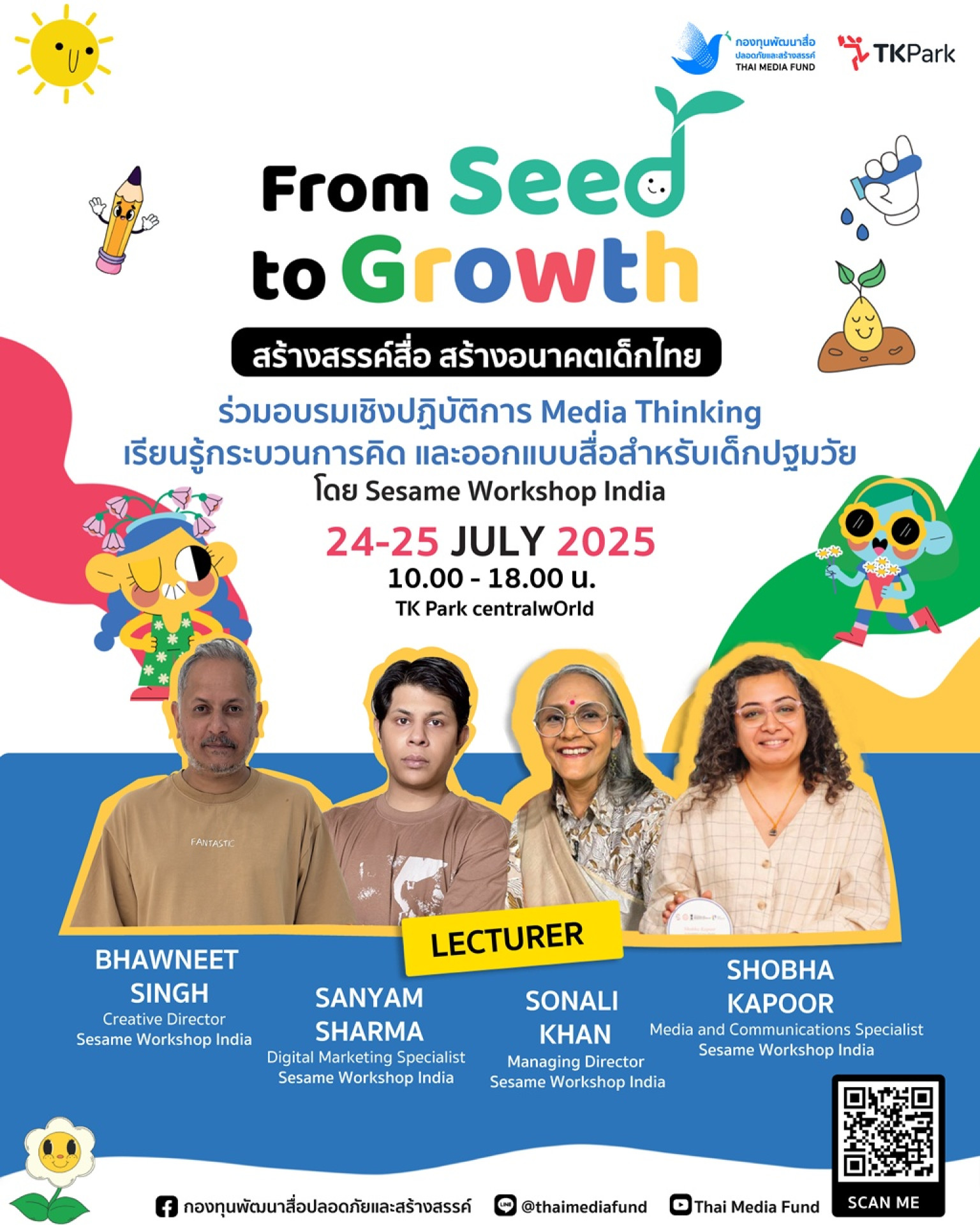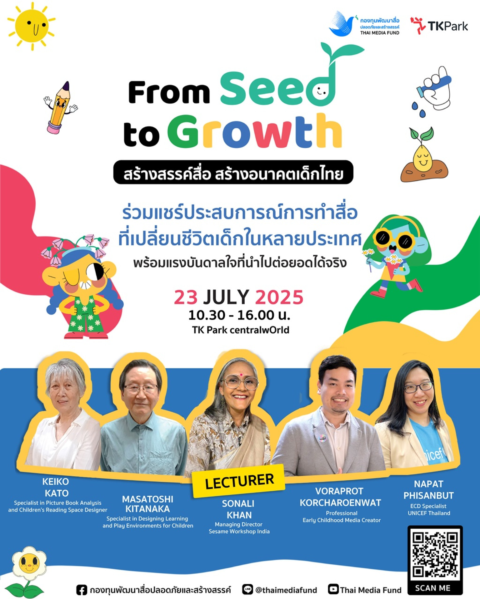 กองทุนพัฒนาสื่อปลอดภัยและสร้างสรรค์ (Thai Media Fund) จัดงาน “From Seed to Growth” สร้างสรรค์สื่อ สร้างอนาคตเด็กไทย โครงการเวทีสร้างการเรียนรู้และการพัฒนาศักยภาพผู้ผลิตสื่อสำหรับเด็กปฐมวัย เพื่อติดอาวุธความรู้และทักษะการผลิตสื่อคุณภาพสูงสำหรับเด็กวัย 0 - 6 ปี ซึ่งเป็นช่วงวัยสำคัญแห่งพัฒนาการ โดยงานจะจัดขึ้นระหว่างวันที่ 23 - 25 กรกฎาคม 2568 ณ ลานสานฝัน และ Learning Auditorium TK Park ชั้น 8 ศูนย์การค้าเซ็นทรัลเวิลด์