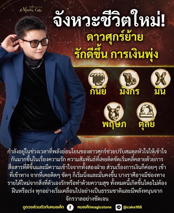 หมอเค้ก Magic stone เปิดชะตา 5 ราศี จังหวะชีวิตใหม่ ดาวศุกร์ย้าย รักดีขึ้น การเงินพุ่ง มีช่องทางรายได้ใหม่จากสิ่งที่ตัวเองรักหรือทำด้วยความสุข