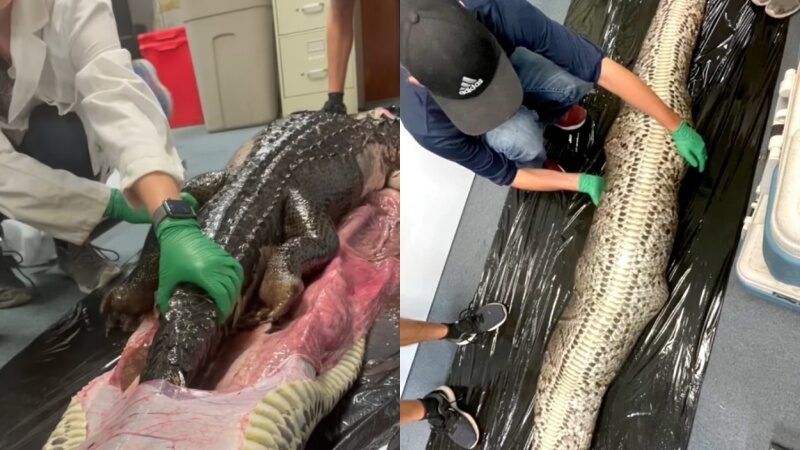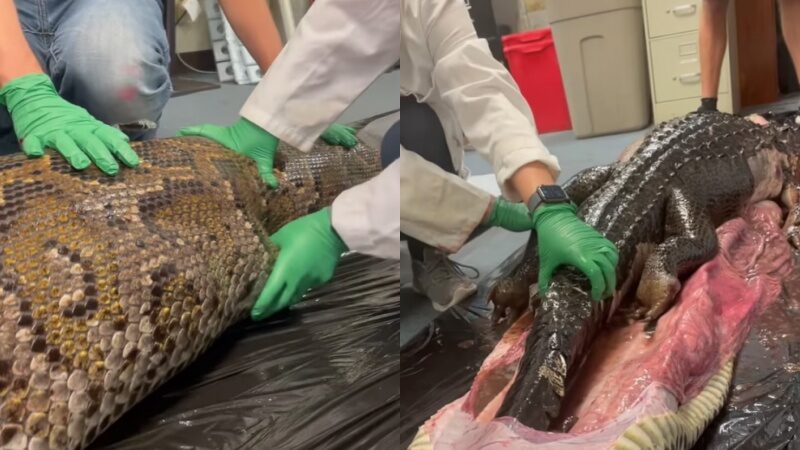 สุดตะลึง! นักวิจัยเผยคลิปวิดีโอชันสูตรหายาก ผ่าท้อง งูหลามยักษ์ 5 เมตร เจอกลืนแอลลิเกเตอร์ 1.5 เมตรทั้งตัว ชี้เป็นสิ่งมีชีวิตต่างถิ่นที่เป็นภัยคุกคามต่อสัตว์ป่าสหรัฐฯ