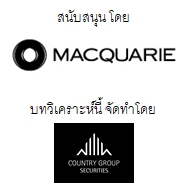 *หมายเหตุ: บทความหรือบทวิเคราะห์บนหลักทรัพย์อ้างอิงหรือดัชนีหลักทรัพย์อ้างอิงด้านบนนี้มาจาก บริษัท หลักทรัพย์ คันทรี่ กรุ๊ป จำกัด (มหาชน) ซึ่งเป็นอิสระ โดยบล.แมคควอรี (ประเทศไทย) จำกัด (“บริษัท”) และบริษัทในเครือมิได้มีส่วนได้ส่วนเสียแต่อย่างใด และความเห็นข้างต้นอาจขัดกับคำแนะนำหรือบทวิเคราะห์ของทางบริษัทและบริษัทในเครือได้ ข้อมูลนี้มิใช่เพื่อประกอบการเสนอขาย ชักชวน หรือแนะนำให้ลงทุนแต่อย่างใด ในกรณีที่มีการอ้างอิงถึงข้อมูลผลงานในอดีต หรือเป้าหมายราคา มิได้เป็นสิ่งยืนยันผลตอบแทนในอนาคต การลงทุนในใบสำคัญแสดงสิทธิอนุพันธ์ (DW) มีความเสี่ยง ผู้ลงทุนจึงควรได้รับคำปรึกษาจากที่ปรึกษาการลงทุนถึงความเหมาะสมในการลงทุน และศึกษาข้อมูลรายละเอียดของการออกและเสนอขาย DW จากแบบแสดงรายการข้อมูลการเสนอขาย DW และร่างหนังสือชี้ชวนที่เกี่ยวข้องให้ครบถ้วนก่อนการลงทุน