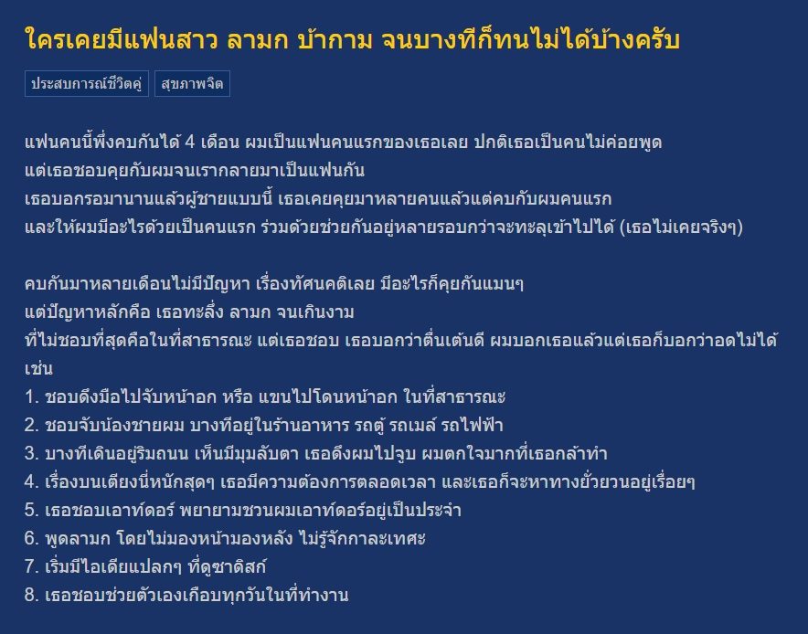 คบกันมาหลายเดือนไม่มีปัญหา เรื่องทัศนคติเลย มีอะไรก็คุยกันแมนๆ แต่ปัญหาหลักคือ เธอทะลึ่ง ลามก จนเกินงาม ที่ไม่ชอบที่สุดคือในที่สาธารณะ แต่เธอชอบ เธอบอกว่าตื่นเต้นดี ผมบอกเธอแล้วแต่เธอก็บอกว่าอดไม่ได้