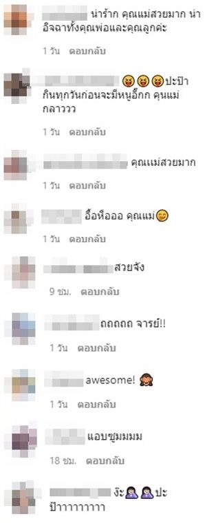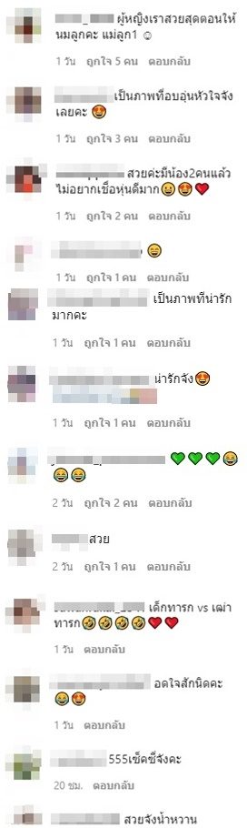 โดยชมเป็นเสียงเดียวกันว่า เป็นภาพที่อบอุ่นของคนเป็นแม่ และที่สำคัญ ไฮโซน้ำหวานเป็นคุณแม่ที่สวยมากๆด้วย บ้างก็มีแซวขอซูมหน่อย “โตแล้วไม่แย่งลูกสิคะ” , “เป็นภาพที่อบอุ่นหัวใจจังเลยคะ” , “เป็นภาพที่น่ารักมากคะ” , “น่าร้าก คุณแม่สวยมาก น่าอิจฉาทั้งคุณพ่อและคุณลูกค่ะ” เป็นต้น