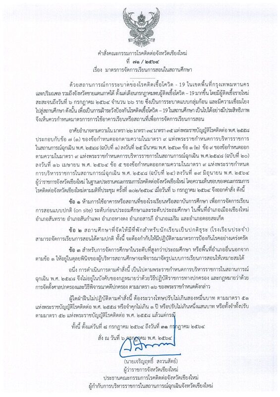 วันที่ 6 ก.ค.64 ที่ประชุมคณะกรรมการโรคติดต่อจังหวัดเชียงใหม่ มีมติให้ออกคำสั่งคณะกรรมการโรคติดต่อจังหวัดเชียงใหม่ ที่ 71/2564 เรื่อง มาตรการจัดการเรียนการสอนในสถานศึกษา โดยสาระสำคัญของคำสั่ง ให้โรงเรียนในพื้นที่ อ.เมืองเชียงใหม่ อ.สันทราย อ.สันกำแพง อ.หางดง อ.สารภี อ.แม่ริม และ อ.ดอยสะเก็ด ห้ามจัดการเรียนการสอนแบบปกติ ซึ่งเรียนโดยใช้อาคารเรียนหรือเรียนในห้องเรียน ในสถานที่ของโรงเรียน หรือแบบ On Site ในระดับชั้นก่อนประถมศึกษา และระดับประถมศึกษา