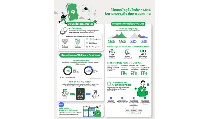 เหล่านี้ถือเป็นโอกาสครั้งใหญ่สำหรับภาคธุรกิจไทย ที่ LINE มุ่งมั่นสร้างสรรค์ พัฒนาขึ้น เพื่อให้ธุรกิจยุคใหม่ สามารถใช้ประโยชน์จากดาต้าและเทคโนโลยีบน LINE เพื่อการเติบโตบนโลกดิจิทัลได้เต็มศักยภาพขึ้นกว่าเดิม ติดตามข่าวสารโซลูชั่นใหม่ๆ เทคนิคการใช้งาน LINE เพื่อธุรกิจได้ทาง LINE: @linebizth เฟซบุ๊กและ Linkedin: LINE for Business