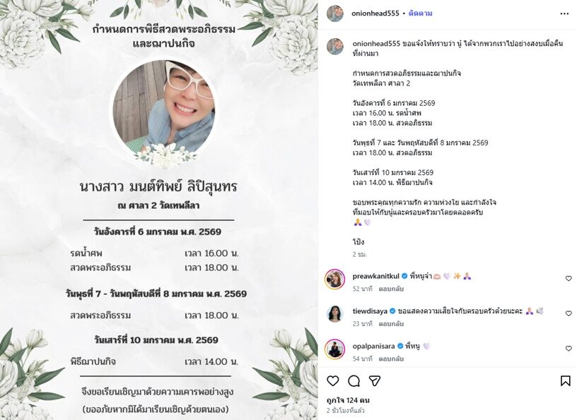 เวลา 14.00 น. พิธีฌาปนกิจ ขอบพระคุณทุกความรัก ความห่วงใย และกำลังใจ ที่มอบให้กับนู๋และครอบครัวมาโดยตลอดครับ - โป้ง”