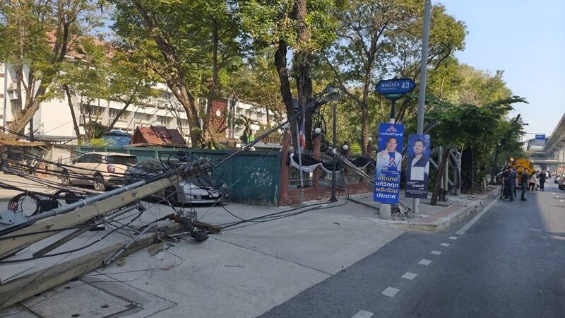 ระทึก รถโม่ปูน เกี่ยวสายไฟขาด เสาไฟฟ้าโค่น 8ต้น ใกล้พรรคภูมิใจไทย