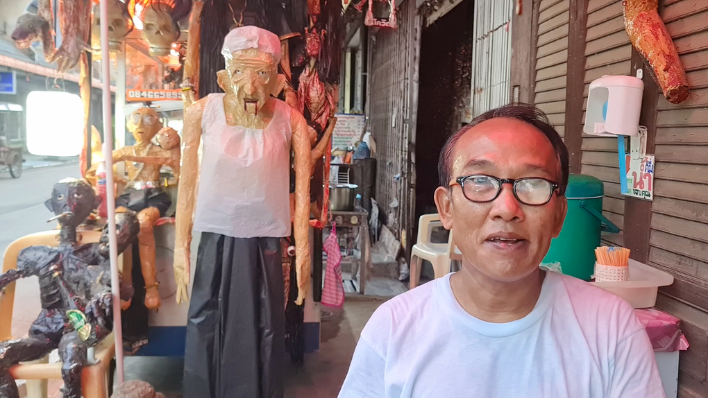 เลยฝึกปั้นงานศิลปะจากถุงพลาสติกกับเทปกาว ทำเป็นรูปผีปอบ ผีกระสือ ผีเปรต ผีพนัน ผีโควิด นางตะเคียน แม่นาก ฯลฯ แล้วก็ชิ้นส่วนอวัยวะมนุษย์ นำมาแขวนตกแต่งไว้หน้าร้าน จนกลายเป็นเอกลักษณ์หนึ่งเดียวในสุโขทัย