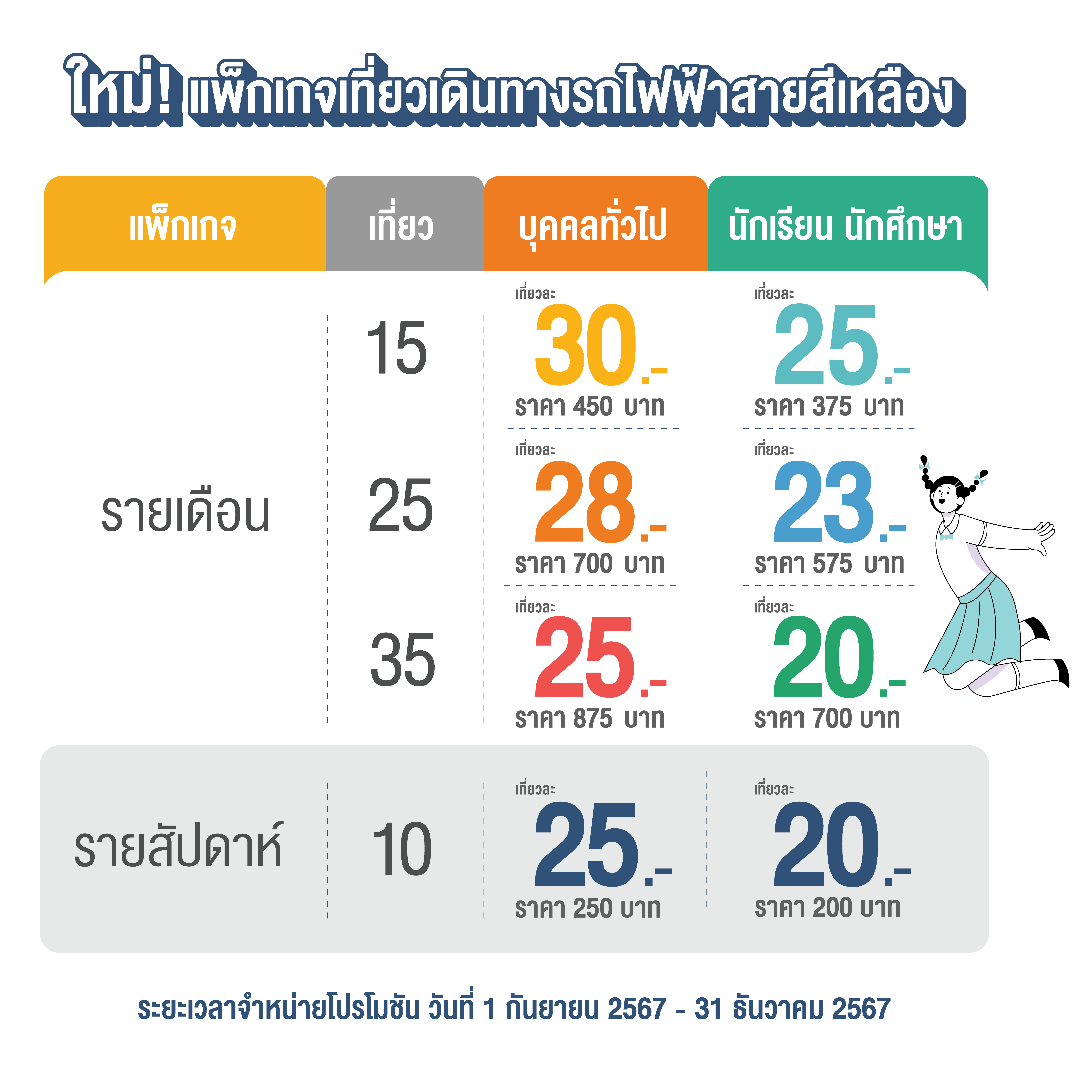 แพ็กเกจเที่ยวเดินทางแบบรายเดือน รถไฟฟ้าสายสีเหลือง สำหรับนักเรียน นักศึกษา