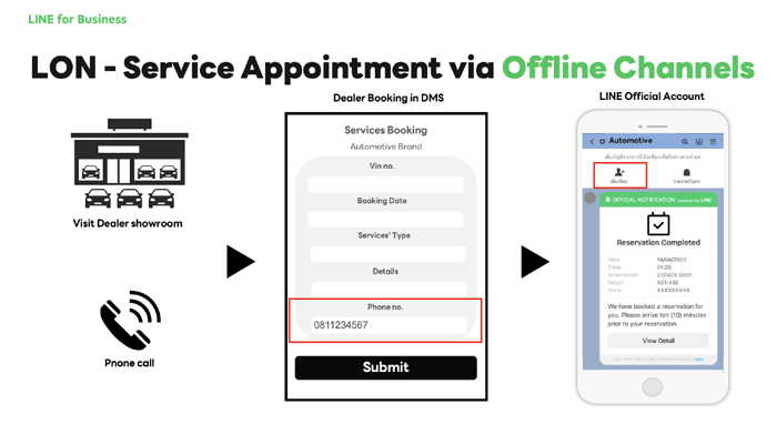 นอกเหนือจากนี้ LINE ยังมีโซลูชั่นใหม่ LINE Official Notification หรือ LON ระบบส่งข้อความแจ้งเตือนสำคัญจากแบรนด์ไปยังลูกค้าผ่าน LINE OA ช่วยให้ลูกค้าไม่พลาดทุกการแจ้งเตือนสำคัญไป ไม่ว่าลูกค้าจะทำการติดต่อเข้ามาผ่านช่องทางอื่น อาทิ แอปฯ ของแบรนด์ โทรศัพท์ หรือจากโชว์รูมออฟไลน์ และแม้จะยังไม่ได้เป็นเพื่อนกับ LINE OA ของแบรนด์ ลูกค้าก็สามารถรับข้อความแจ้งเตือน LON นี้ได้ เพราะอาศัยข้อมูลเบอร์โทรศัพท์ที่แบรนด์มีในการส่ง อาทิ แจ้งเตือนการนัดหมายและยืนยันเพื่อพบกับดีลเลอร์หรือเทสไดรฟ์ แจ้งเตือนกำหนดการเข้ารับบริการเช็ครถ เป็นต้น นับว่า LON นี้ถือเป็นอีกหนึ่งตัวช่วยสำคัญให้แบรนด์สามารถสร้างประสบการณ์บริการหลังการขายให้ดียิ่งขึ้นได้ และช่วยทำให้การเพิ่มเพื่อนเป็นไปอย่างมีประสิทธิภาพและตรงกลุ่มเป้าหมายไปด้วยในตัว