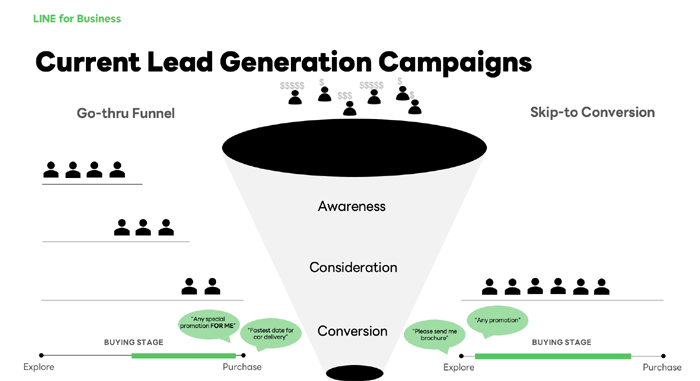 โดยทั่วไปการเก็บ Leads จากแคมเปญการตลาดของแบรนด์รถยนต์ จะนิยมทำใน 2 แนวทาง คือแบบ Go-thru Funnel และแบบ Skip-to Conversion โดยแต่ละแนวทางมีจุดเด่นและจุดด้อยแตกต่างกันออกไป การเก็บ Leads ด้วยแนวทาง Go-thru Funnel คือการวางแผนแคมเปญแบบดั้งเดิมในเชิงการตลาด คือ เริ่มจากการสร้างการรับรู้แคมเปญ (Campaign Awareness) สร้างความเชื่อมั่นเพื่อให้เกิดการพิจารณา (Consideration) และสื่อสารเพื่อให้เกิดการตัดสินใจซื้อ (Conversion) แม้แนวทางดังกล่าวจะใช้ระยะเวลายาวนานพอสมควร แต่ Leads หรือกลุ่มเป้าหมาย จะได้รับข้อมูลหรือสิ่งที่แคมเปญต้องการสื่อสารครบ มีส่วนช่วยทำให้เกิดการตัดสินใจซื้อที่ง่ายขึ้น