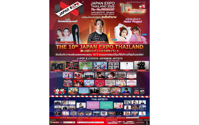 JAPAN EXPO THAILAND 2025 Celebrate 10th Anniversary ฉลองมิตรภาพอันเป็นนิจนิรันดร์ที่ไม่มีวันสิ้นสุด จัดเต็มความบันเทิงทุกรูปแบบ โดยเฉพาะการมอบความสุขทางดนตรี โดยในปีนี้ยังคงคึกคักไปด้วยศิลปินญี่ปุ่นและไทยกว่า 500 ชีวิตที่จะมารวมตัวกันในงานนี้ สับเปลี่ยนหมุนเวียนมอบความสุขสุดสนุกแบบไร้ขีดจำกัดให้กับผู้เข้าร่วมงานตลอด 3 วันเต็ม พร้อมฉลองครบรอบ 10 ปีอย่างยิ่งใหญ่ด้วย Celebration Song สุดพิเศษ! ปีนี้ จี-ยู ครีเอทีฟ จับมือ Hello! Project นำเพลงฮิตระดับตำนาน "LOVE Machine" ของวง Morning Musume มารีเมคใหม่ในเวอร์ชันไทย ในชื่อ "LOVE Machine รักนิรันดร์" ถ่ายทอดกลิ่นอายไทย-ญี่ปุ่น โดย กฤษติกร พรสาธิต (ติ๊ก Playground) ขับร้องโดย 8 ศิลปินหญิงชั้นนำ ได้แก่ ม่านมุก-ชดาธาร, มุกกิ-ณิชชา, น้ำเพชร ไอลีน, แอ๊นท์-วรินดา, รินะ อิชึตะ, มิวสิค-แพรวา และ รตา ชินกระจ่างกิจ เพื่อสื่อถึงมิตรภาพอันยั่งยืนระหว่างไทย-ญี่ปุ่น