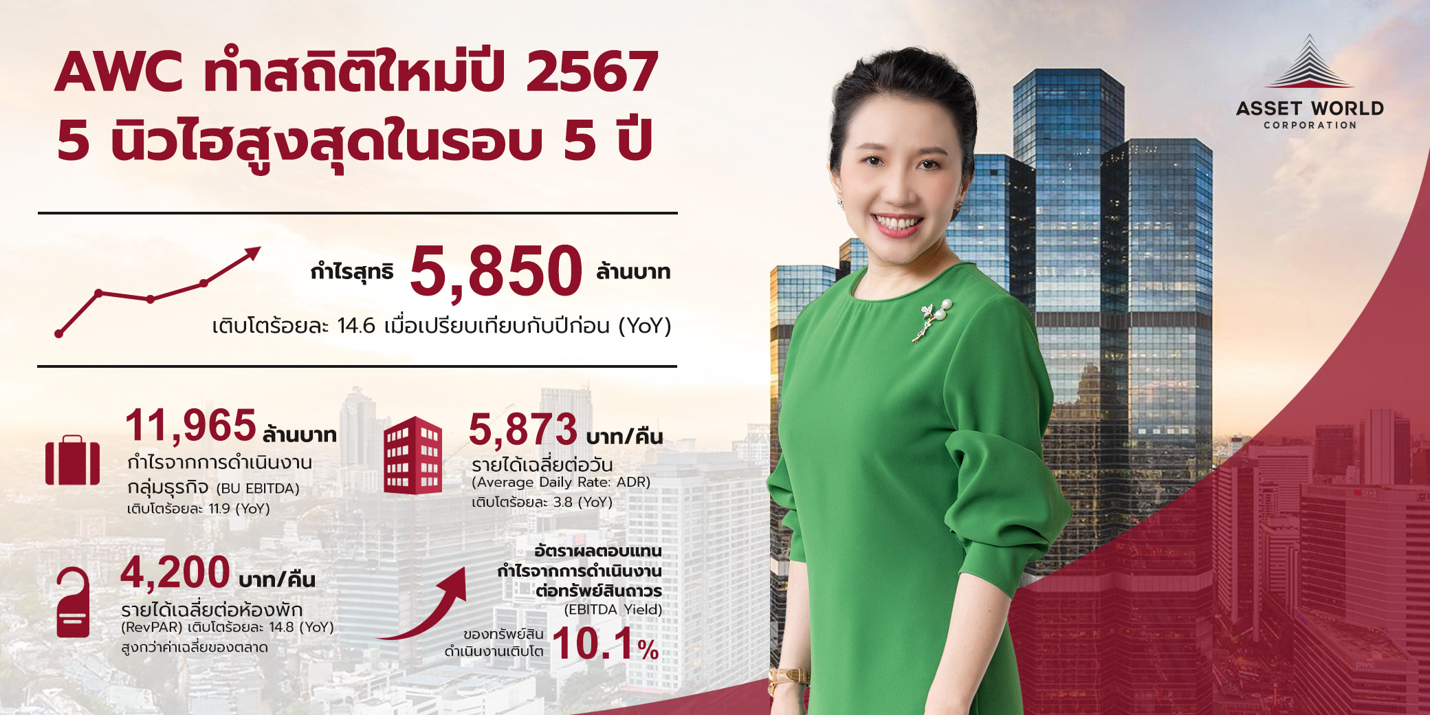 วัลลภา ไตรโสรัส แม่ทัพใหญ่ของ บมจ. แอสเสท เวิรด์ คอร์ป หรือ AWC เจ้าของโครงการอสังหาฯ ดัง อาทิ เอเชียทีค, อาคารเอ็มไพร์, ดิ แอทธินี โฮเทล แบงค็อก เปิดเผยว่า ผลประกอบการปี 2567 บริษัทฯ ทำรายได้รวม 21,011 ล้านบาท เติบโต 10.5% (YoY) และกำไรสุทธินิวไฮ 5,850 ล้านบาท เติบโต 14.6% (YoY)