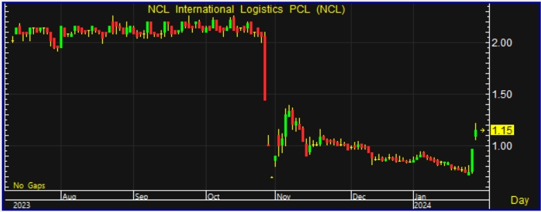 ผู้สื่อข่าวรายงานว่า วันนี้(26 ม.ค.67) ราคาหุ้นบริษัท เอ็นซีแอล อินเตอร์เนชั่นแนล โลจิสติกส์ จำกัด (มหาชน) หรือ NCL ณ เวลา 10 : 26 น. อยู่ที่ระดับ 1.15 บาท บาท บวก 0.18 บาท ราคาสูงสุด 1.22 บาท ราคาต่ำสุด 1.06 บาท หรือเพิ่มขึ้น 18.56% ด้วยมูลค่าซื้อขาย 61.37 ล้านบาท โดยราคาหุ้นนิวไฮรอบ 2 เดือน โดยเทียบตั้งแต่หุ้นยืนที่ระดับ 1.16 บาท เมื่อวันที่ 10 พ.ย.66