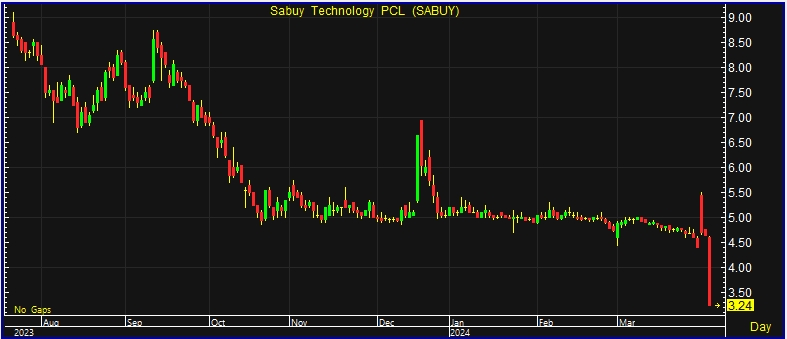 ผู้สื่อข่าวรายงานว่า วันนี้ (3 เม.ย.67) ราคาหุ้น บริษัท สบาย เทคโนโลยี จำกัด (มหาชน) หรือ SABUY ปิดตลาดที่ระดับ 3.24 บาท ลบ 1.40 บาท หรือ 30.17% ราคาสูงสุดที่ 4.62 บาท และทำจุดต่ำสุดที่ 3.24 บาท ด้วยมูลค่าการซื้อขาย 414.50 ล้านบาท โดยราคาหุ้นปรับตัวต่ำสุดของวัน(Floor) ที่ระดับ 3.24 บาท