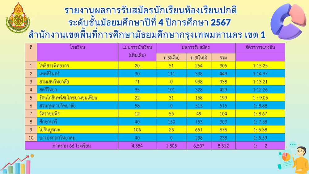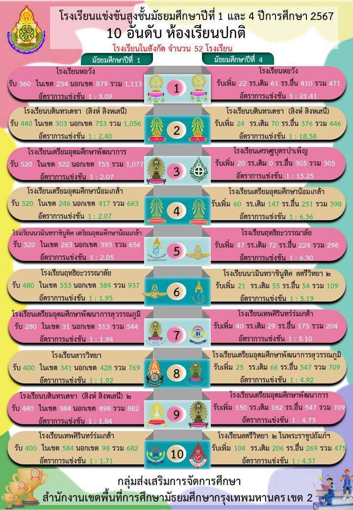 สำหรับ 10 อันดับโรงเรียนยอดนิยม ชั้นม.4 ดังนี้ โรงเรียนหอวัง รับ 22 ราย สมัคร 471 ราย อัตราการแข่งขัน 1:21.41, โรงเรียนบดินทรเดชา (สิงห์ สิงหเสนี) รับ 24 ราย สมัคร 446 ราย อัตราการแข่งขัน 1:18.58,โรงเรียนเศรษฐบุตรบำเพ็ญ รับ 20 ราย สมัคร 305 ราย อัตราการแข่งขัน 1:15.25,