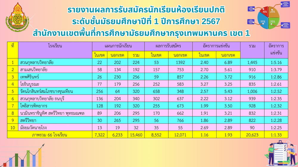 เปิด 10 อันดับ โรงเรียนดังกทม. มีผู้สมัคร มากที่สุด ‘สวนกุหลาบ-หอวัง’ แชมป์ ม.4 แข่งดุ อัตราการแข่งขันสูงสุด 1:21.41 ม.1 สอบ 23 มี.ค.67