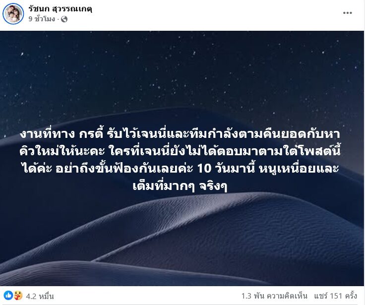 อย่างไรก็ตาม เจนนี่ รัชนก สุวรรณเกตุ ได้โพสต์ข้อความล่าสุดด้วยว่า “งานที่ทาง กรตี้ รับไว้เจนนี่และทีมกำลังตามคืนยอดกับหาคิวใหม่ให้นะคะ ใครที่เจนนี่ยังไม่ได้ตอบมาตามใต้โพสต์นี้ได้ค่ะ อย่าถึงขั้นฟ้องกันเลยค่ะ 10 วันมานี้ หนูเหนื่อยและเต็มที่มากๆ จริงๆ”