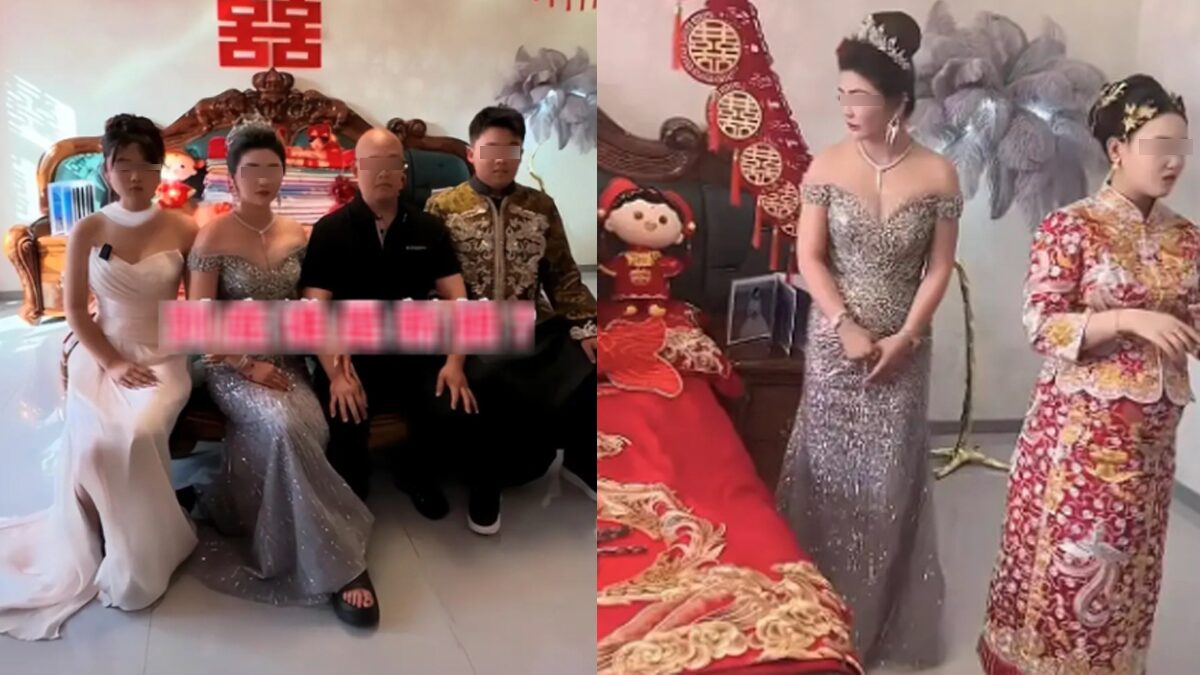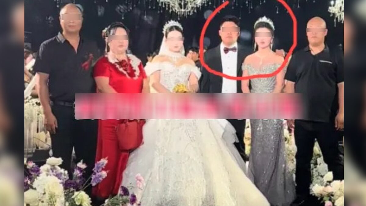 จากคลิปที่เผยแพร่ “นางจาง” แม่เจ้าบ่าวปรากฏตัวในชุดราตรีสีเทาระยิบระยับ สวมมงกุฎและเครื่องเพชรสุดหรู ช่วงถ่ายภาพครอบครัว เจ้าบ่าวยังยืนชิดและโอบไหล่แม่ ปล่อยให้เจ้าสาวยืนลำพัง จนแขกบางคนเข้าใจผิด