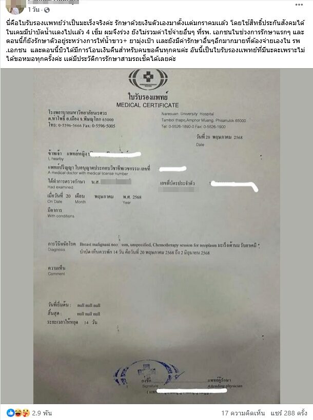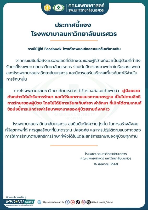 ขณะที่ วันที่ 16 ส.ค.68 คณะแพทยศาสตร์ รพ.มหาวิทยาลัยนเรศวร ก็ออกมาประกาศชี้แจงเรื่องนี้ด้วยว่า “Official announcement ประกาศชี้แจง รพ.มหาวิทยาลัยนเรศวร กรณีมีผู้ใช้ Facebook โพสต์ภาพและข้อความการรักษาตัวที่โรงพยาบาล และขอรับบริจาคเงิน ทั้งนี้เพื่อให้ประชาชนเข้าใจ ข้อเท็จจริง เรื่องการเบิกจ่ายค่ารักษาพยาบาลตามสิทธิที่ถูกต้อง จึงเรียนชี้เเจงดังนี้”
