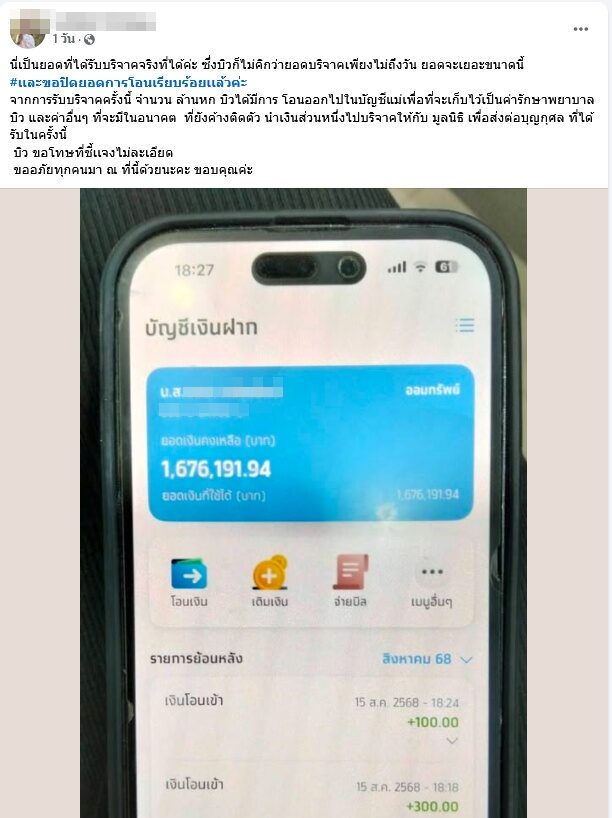 “ตอนนี้มีคนขอเงินคืน บิวคืนให้ทุกคนนะคะเเละมีการโอนคืนไปเยอะเเล้ว หากใครต้องการเงินคืนทักเเชทมาได้เลยค่ะ #เงินทุกบาททุกสตางค์บิวนำไปรักษาตัวจริงค่ะยังเหลืออีกหลายขั้นตอนในการรักษาซึ่งต้องใช้เงิน”