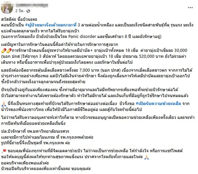 ดราม่าหนัก สาวป่วยมะเร็งโพสต์รับบริจาคไม่ถึงวันได้ยอดกว่า 1.6 ล้าน รพ.ชี้แจงไม่มีการเรียกเก็บค่ายาค่ารักษา บิว ขอโทษแจงไม่ละเอียด พร้อมคืนเงินคนบริจาค