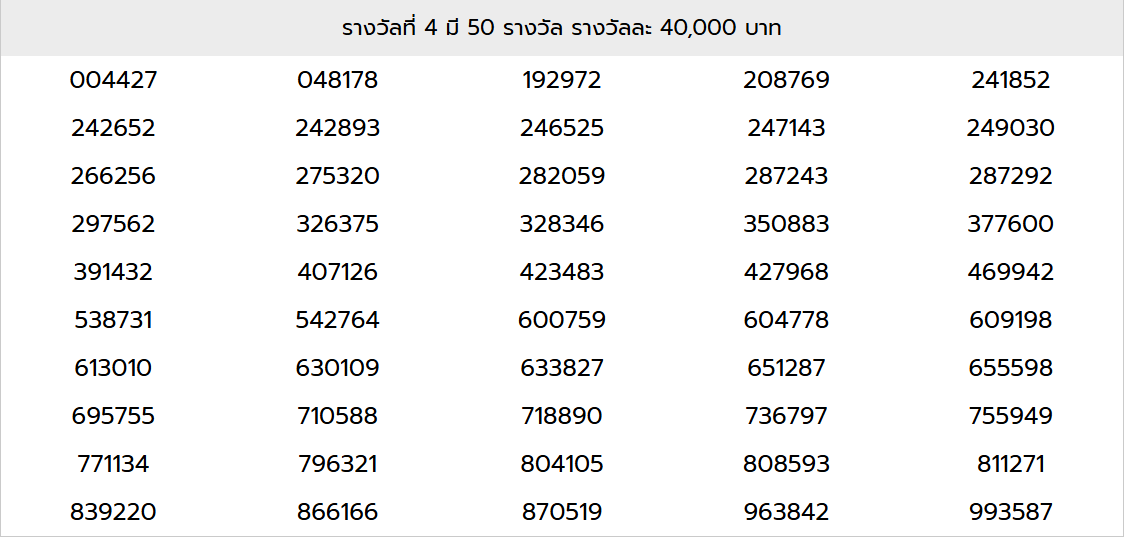 ผลสลาก รางวัลที่ 4 มี 50 รางวัล รางวัลละ 40,000 บาท