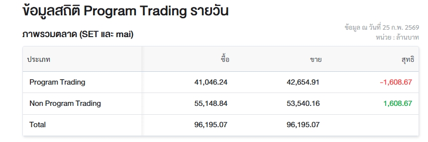ผู้สื่อข่าวรายงานว่า วันนี้ (25 ก.พ.69) ตลาดหลักทรัพย์แห่งประเทศไทย (ตลท.) เปิดเผยข้อมูลซื้อขายรายวันผ่าน Program Trading หรือ “โปรแกรมโรบอทเทรดดิ้ง” พบว่ามีมูลค่าซื้อจำนวน 41,0446.24 ล้านบาท และมูลค่าขายจำนวน 42,654.91 ล้านบาท เท่ากับขายสุทธิ 1,608.67 ล้านบาท