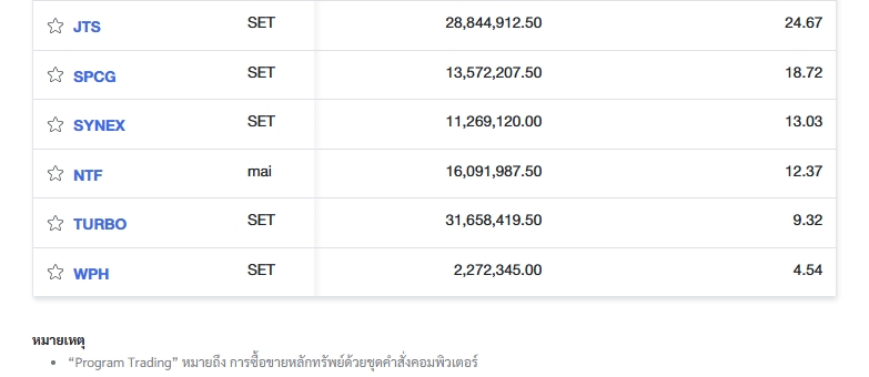 นอกจากนี้ ตลาดหลักทรัพย์แห่งประเทศไทย (ตลท.) รายงานข้อมูลหลักทรัพย์ที่มีการซื้อขายผ่านระบบ Program Trading สูงสุด โดยพิจารณาจากสัดส่วนมูลค่า Program Trading เทียบกับมูลค่าการซื้อขายแบบ Auto Matching พบว่ามี หลักทรัพย์ที่มีการทำรายการสูงสุดในวันนี้ ได้แก่