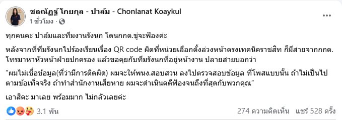 ชลณัฏฐ์ ผู้สมัคร สส.พรรคประชาชน โดนกกต.ขู่จะฟ้อง ปมโพสต์ QR Code เจอผู้สมัครปี 66 จะให้พนง.สอบสวน ลงไปตรวจสอบ ถ้าไม่จริงจะดำเนินคดีฟ้องจนถึงที่สุด