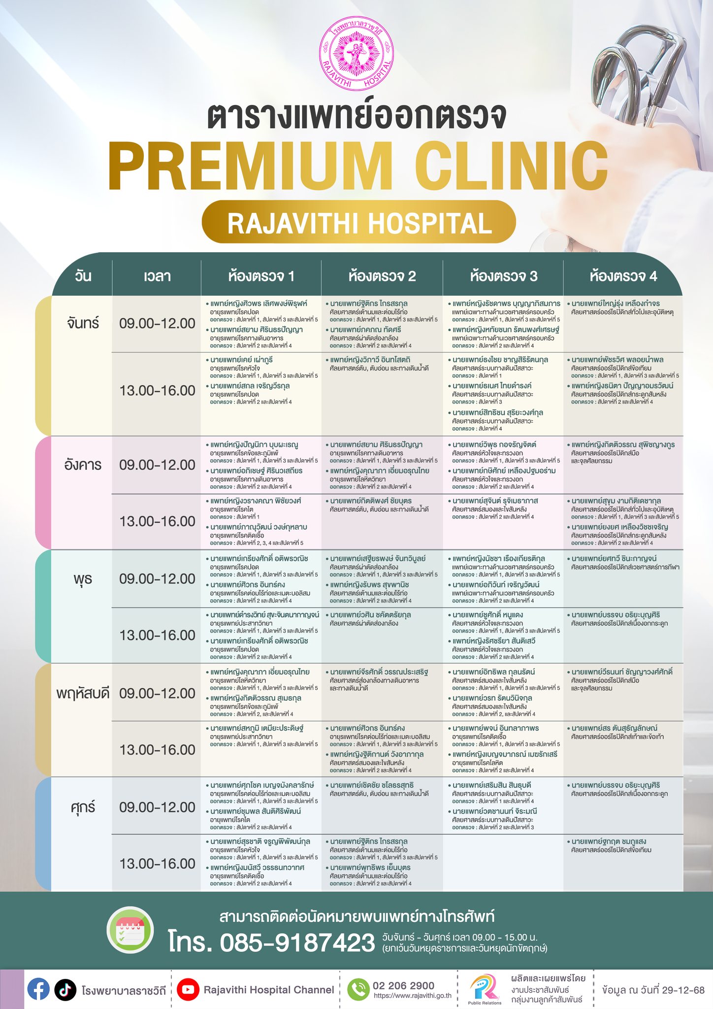 ผู้สื่อข่าวรายงานว่า โรงพยาบาลราชวิถี กรมการแพทย์ พร้อมเปิดให้บริการ “Premium Clinic” ในเวลาราชการ ตั้งแต่วันที่ 20 มกราคม 2569 เป็นต้นไป ขานรับนโยบายกระทรวงสาธารณสุข ปี พ.ศ. 2569 เพื่อเพิ่มทางเลือกใหม่ในการเข้าถึงบริการทางการแพทย์ สำหรับผู้ป่วยที่ต้องการความสะดวก รวดเร็ว ลดระยะเวลาการรอคอยในการตรวจรักษา และวินิจฉัยโรคโดยแพทย์เฉพาะทาง