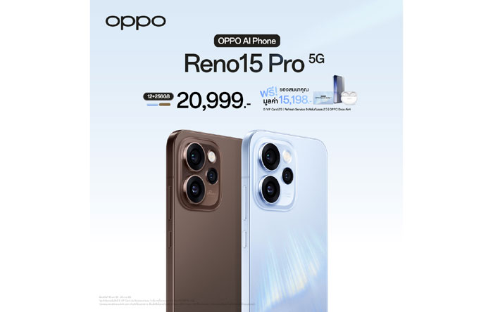 OPPO ประกาศวางจำหน่าย “OPPO Reno15 Series 5G” สมาร์ตโฟนเพื่อนซี้ เทรนดี้ทุกช็อต รุ่นใหม่ล่าสุด วางจำหน่ายในราคาสุดคุ้ม เริ่มต้นเพียง 11,999 บาท มาพร้อมโปรโมชั่นสุดพิเศษในช่วงวันนี้ - 28 กุมภาพันธ์ 2569 อีกทั้งยังมอบทุกประสบการณ์การใช้งานด้วย 2 ผลิตภัณฑ์ IoT ใหม่ อย่าง OPPO Watch S วางจำหน่ายในราคาเริ่มต้น 5,999 บาท และ OPPO Pad 5 ในราคาเริ่มต้น 13,999 บาท