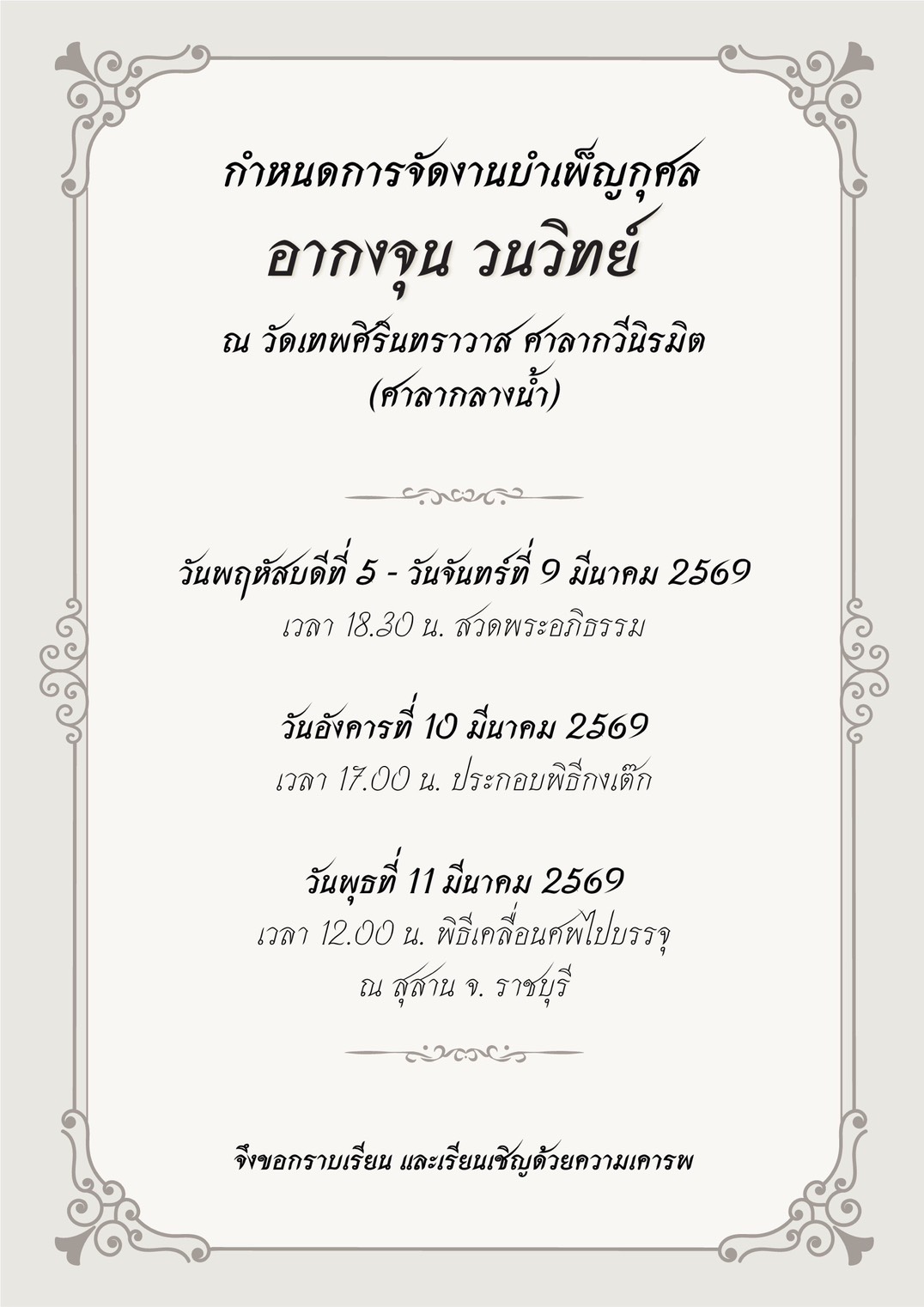 กำหนดสวดพระอภิธรรม ณ วัดเทพศิรินทราวาส ศาลากวีนิรมิต (ศาลากลางน้ำ) วันพฤหัสบดีที่ 5 – วันจันทร์ที่ 9 มีนาคม 2569 และวันอังคารที่ 10 มีนาคม 2569 – เวลา 17.00 น. ประกอบพิธีกงเต๊ก