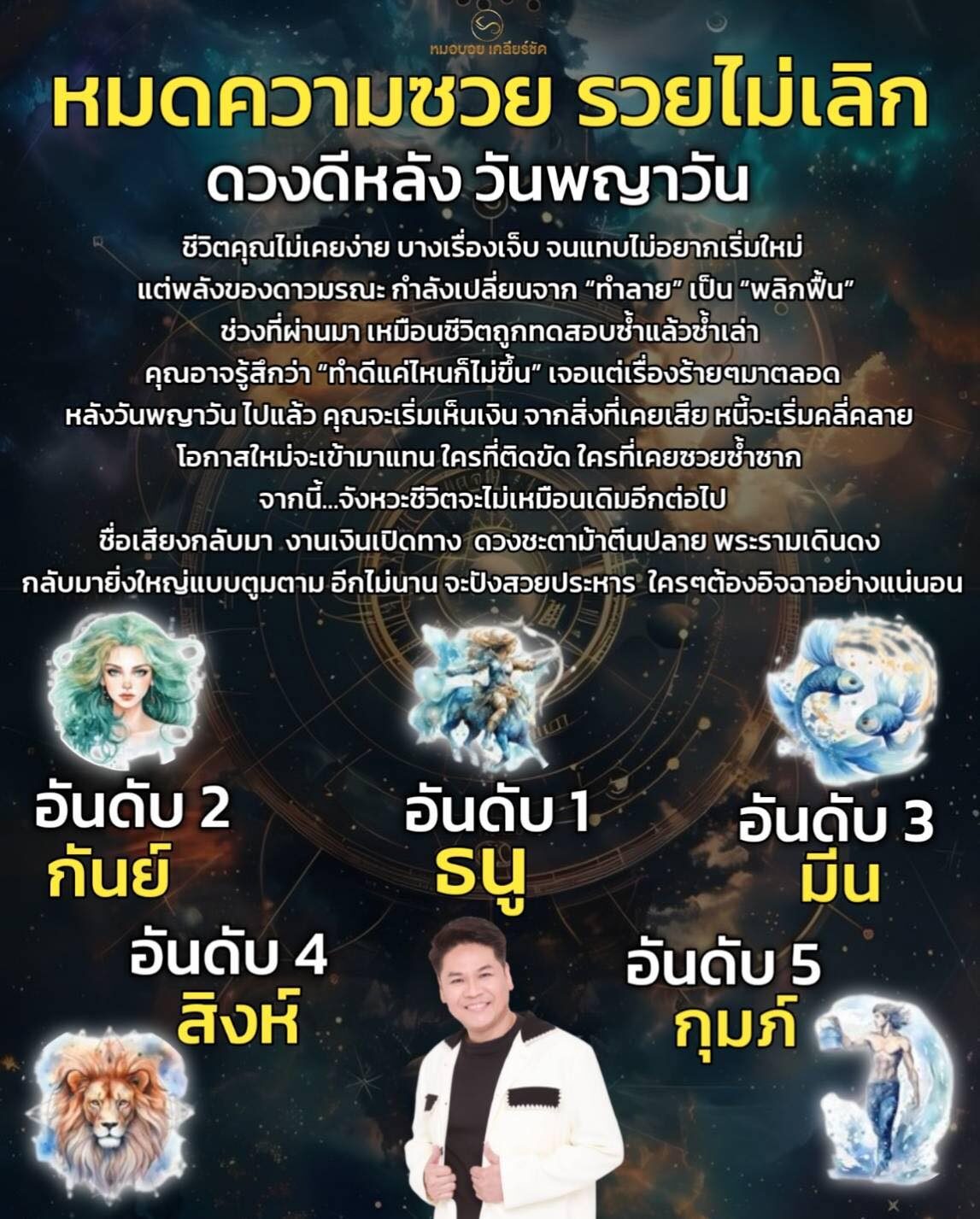 สำหรับ 5 อันดับราศี ประกอบด้วย อันดับ 1 ราศี ธนู อันดับ 2 ราศีกันย์ อันดับ 3 ราศีมีน อันดับ 4 ราศีสิงห์ อันดับ 5 ราศีกุมภ์