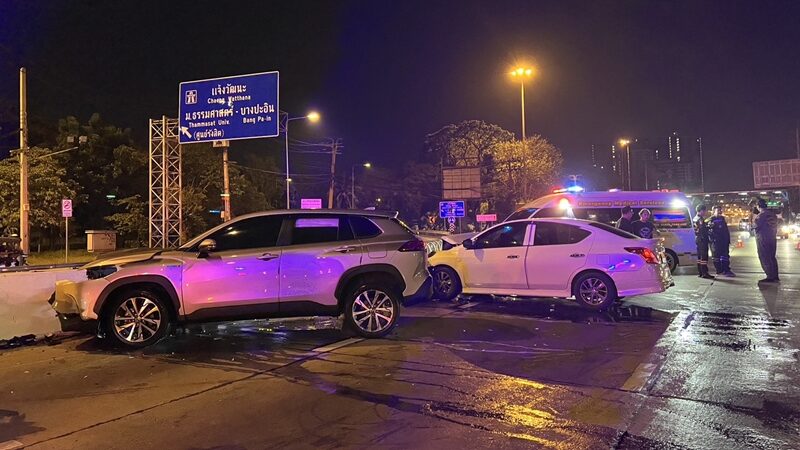 เมื่อเวลา 04.00 น. วันที่ 14 มี.ค.2569 เจ้าหน้าที่ตำรวจ สภ.รัตนาธิเบศร์ รับแจ้งเหตุรถเก๋งชนกัน บริเวณใต้ทางด่วนถนนงามวงศ์วาน ต.ตลาดขวัญ อ.เมือง จ.นนทบุรี จึงรุดไปตรวจสอบพร้อมอาสาสมัครมูลนิธิร่วมกตัญญู และกู้ชีพจากเทศบาลนครนนทบุรี