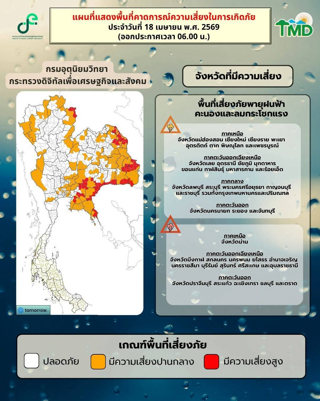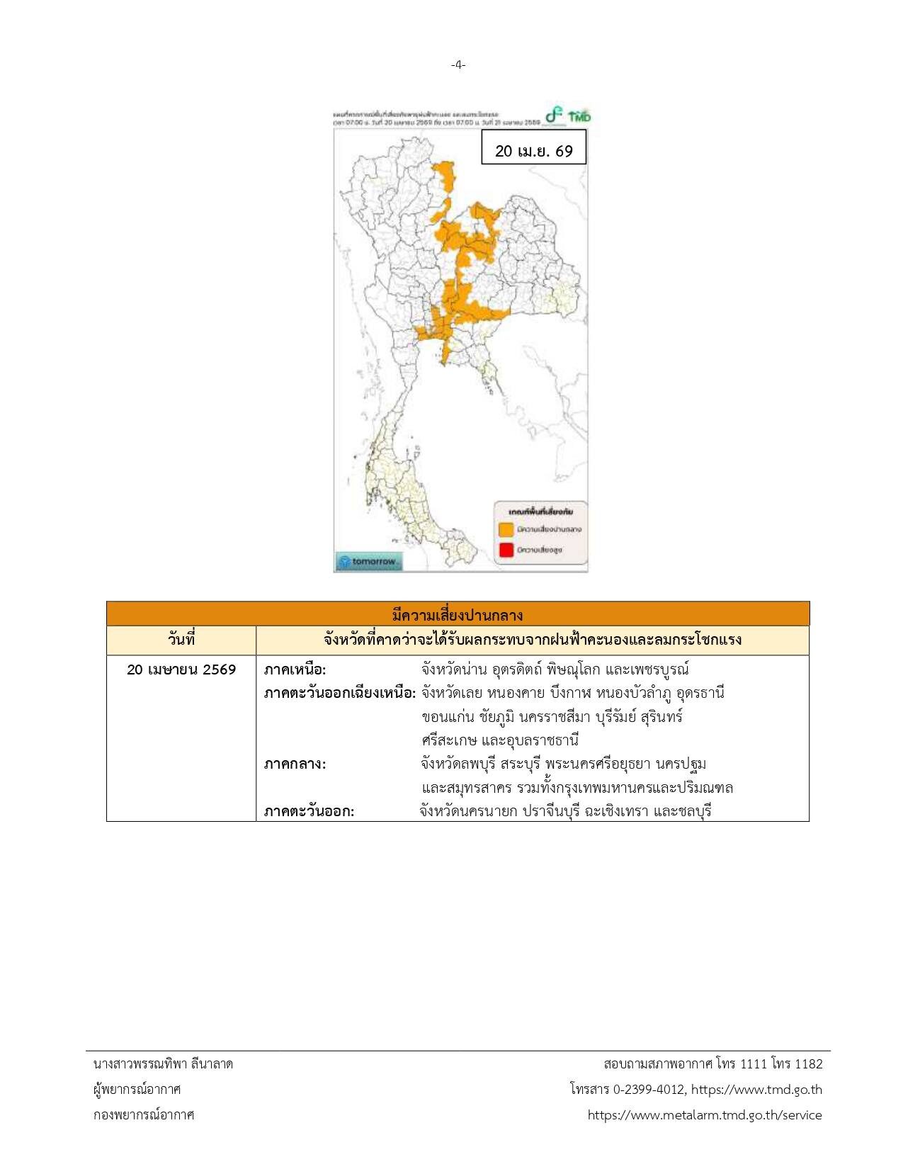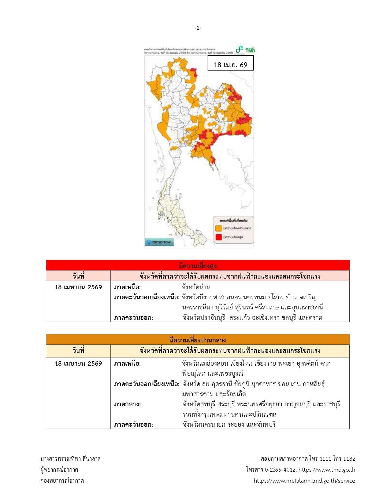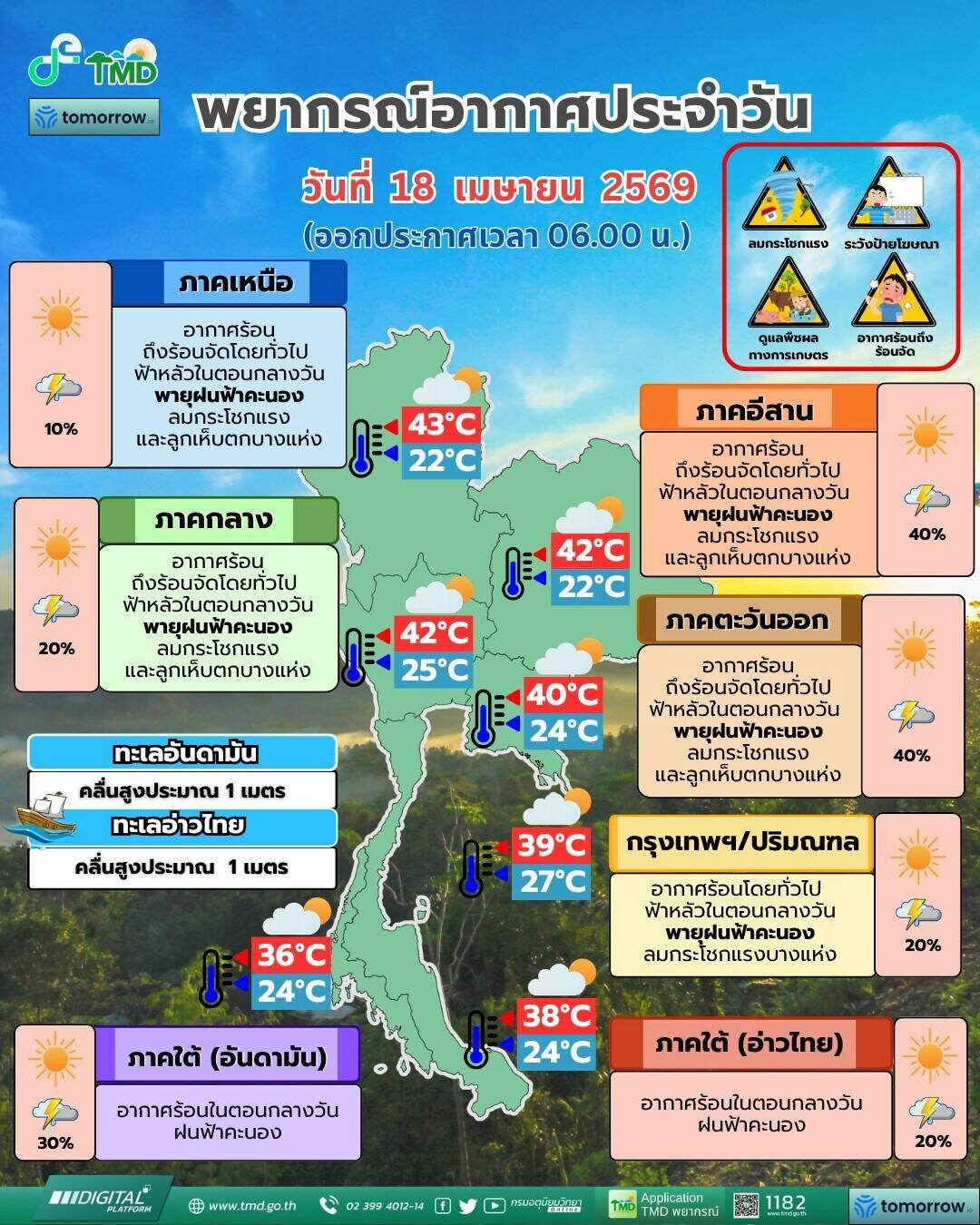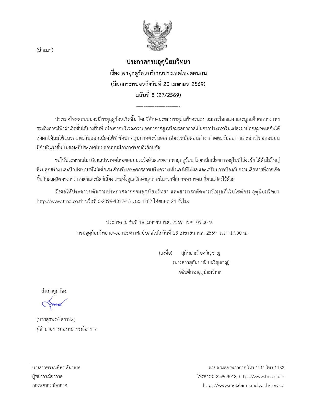 จึงขอให้ประชาชนติดตามประกาศจากกรมอุตุนิยมวิทยา และสามารถติดตามข้อมูลที่เว็บไซต์กรมอุตุนิยมวิทยา http://www.tmd.go.th หรือที่ 0-2399-4012-13 และ 1182 ได้ตลอด 24 ชั่วโมง ประกาศ ณ วันที่ 18 เมษายน พ.ศ. 2569 เวลา 05.00 น. กรมอุตุนิยมวิทยาจะออกประกาศ