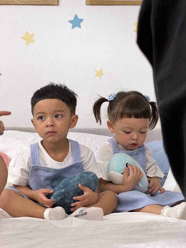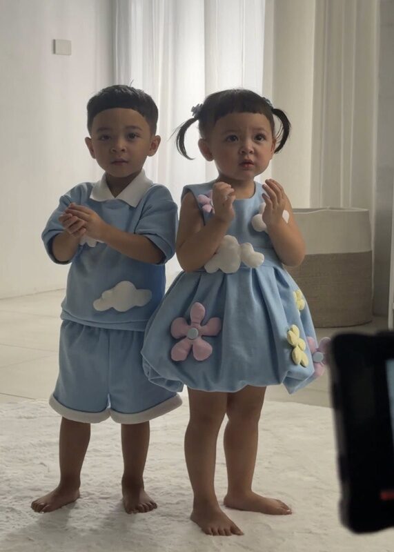 เม : “ไปหัวเราะ ไปยิ้มไปขำเขาก็จะจำ แต่ว่าชาวเน็ตแคปแล้ว หนูก็ขอโทษ บางทีมันเป็นวิดีโอสั้นๆ บางทีเขาจะแคปไปลงกันต่อ มันอาจจะเป็นโมเมนต์สั้นๆ จริงๆ แต่ว่าทางเราทางครอบครัวจะมีการบอกพี่เลี้ยง บอกครอบครัวตลอดว่า เวลานี้ทำอะไรได้แล้วก็ทำไม่ได้เพราะว่ามีเด็กสองคน กำลังเรียนรู้ก๊อปปี้พวกเราอยู่”