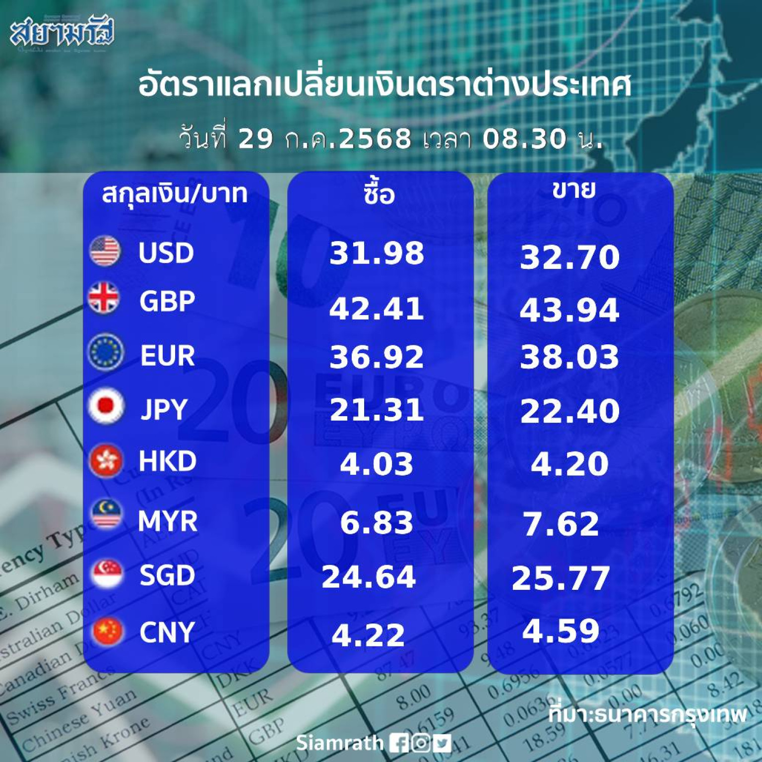 อัตราแลกเปลี่ยนเงินตราต่างประเทศวันนี้ (29 ก.ค.68)