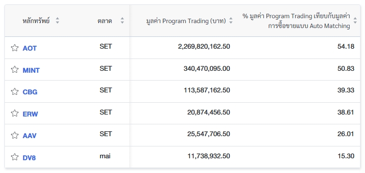นอกจากนี้ ตลท.ยังรายงานข้อมูลหลักทรัพย์ที่ใช้ Program Trading ซื้อขายสูงสุด 6 อันดับโดยเรียงจาก % มูลค่า Program Trading เทียบกับมูลค่าการซื้อขายแบบ Auto Matching ได้แก่