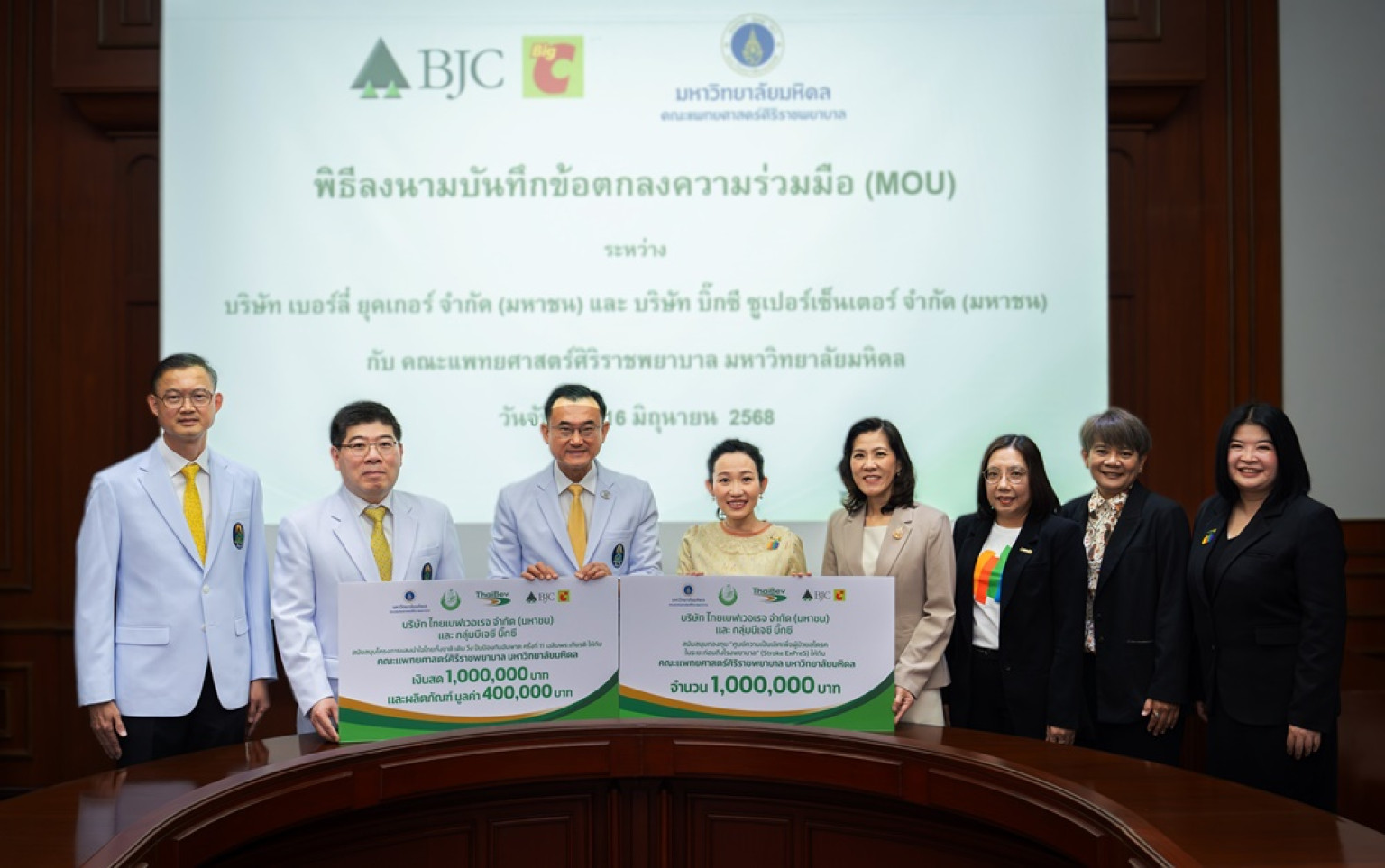 สนับสนุน…ไทยเบฟเวอเรจ และ กลุ่มบีเจซี บิ๊กซี มอบเงินสนับสนุนคณะแพทยศาสตร์ ศิริราชพยาบาล ม.มหิดล เพื่อนำไปใช้ ในโครงการแสงนำใจไทยทั้งชาติ เดิน วิ่ง ปั่นป้องกันอัมพาต ครั้งที่ 11 เฉลิมพระเกียรติ 1 ล้านบาท พร้อมสนับสนุนผลิตภัณฑ์ 4 แสนบาท และ สนับสนุนกองทุนศูนย์ความเป็นเลิศเพื่อผู้ป่วยสโตรค ในระยะก่อนถึงโรงพยาบาล 1 ล้านบาท โดยมี ศ.นพ.อภิชาติ อัศวมงคลกุล ศ.ดร.นพ.ยงยุทธ ศิริวัฒนอักษร และ รศ.นพ.ยงชัย นิละนนท์ รับมอบจากฐาปณี เตชะเจริญวิกุล ภาวินี ไชยสิทธิ์ธีรวรรณ ศรีสุข ภญ.ปาณิสรา ไชยรุ่งรัตน์ และ เหมวรรณ พูนผล ที่โรงพยาบาลศิริราช