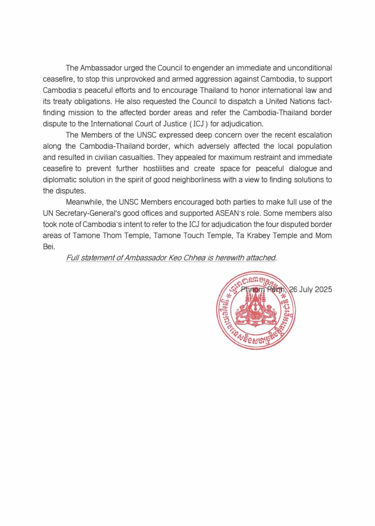 โดยในแถลงการณ์ ระบุว่า เอกอัครราชทูตกัมพูชาประจำสหประชาชาติ ได้กล่าวในที่ประชุม คณะมนตรีความมั่นคงแห่งสหประชาชาติ และได้กล่าวหาว่าไทยใช้กำลังทางทหารอย่างจงใจและไร้การยั่วยุ ด้วยอาวุธหนักทั้งเครื่องบินเอฟ-16 รถถัง และระเบิดคลัสเตอร์