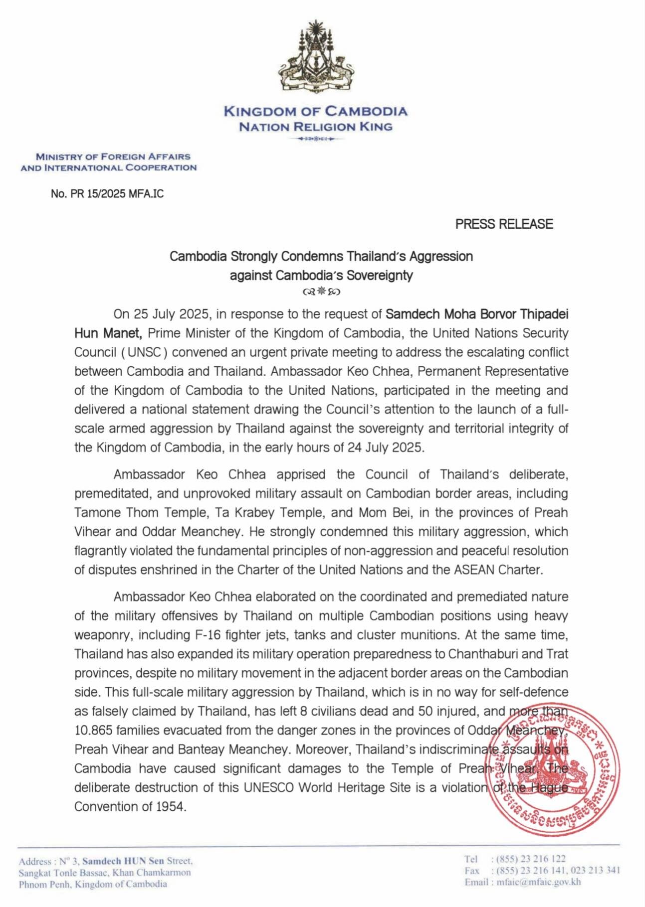 กระทรวงการต่างประเทศ กัมพูชา แถลงประณามไทย โจมตีด้วยอาวุธหนัก อ้างปราสาทพระวิหารเสียหาย ร้อง UNSC สั่งหยุดยิงทันที นำข้อพิพาทขึ้นศาลโลก