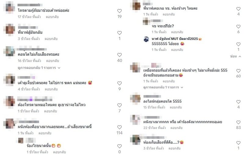 “คอนโดไม่เก็บเสียงหรอคะ , ผนังห้องคือบางมากเลยนะคะ…ถ้าเสียงขนาดนี้ , เหมือนรอบที่แล้วก็เคยลง ห้องข้างๆ ไม่มาเห็นมั่งอ่ะ 555 ยังจะมีรอบสองรอบสาม , คนที่เห็นคลิปนี้ได้เจ็บแทนไปแล้ว , เมื่อไหร่เจ้าของห้องจะรู้ตัวค่ะ , ห้องข้างๆทำคอนเท้นต์ป่ะ ร้องดังร้องเว่อขนาดนี้ , เรียกกู้ภัยค่ะ , โหหหหหหหหหห แบบนี้เลยหรอ เป็นต้น”