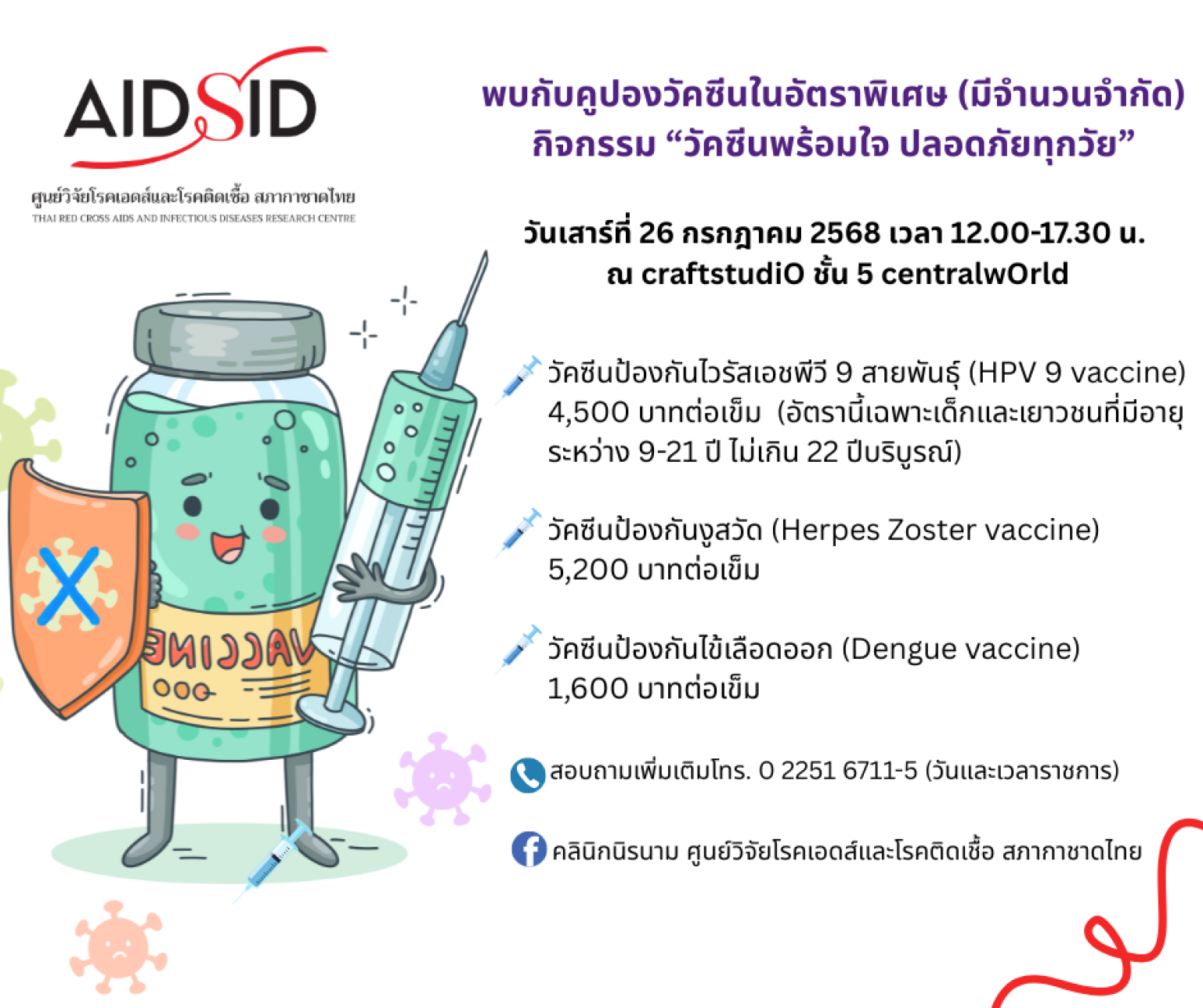 ผู้สนใจสามารถเข้าซื้อคูปองวัคซีนในอัตราพิเศษ (มีจำนวนจำกัด) ในกิจกรรม “วัคซีนพร้อมใจ ปลอดภัยทุกวัย” เสาร์ที่ 26 ก.ค.68 เวลา 12.00-17.30 น. ที่craftstudiO ชั้น 5 centralwOrld สอบถามเพิ่มเติมได้ที่ 0 - 2251 - 6711-5 (วันและเวลาราชการ) หรือเฟซบุ๊กเพจ : คลินิกนิรนาม ศูนย์วิจัยโรคเอดส์และโรคติดเชื้อ สภากาชาดไทย